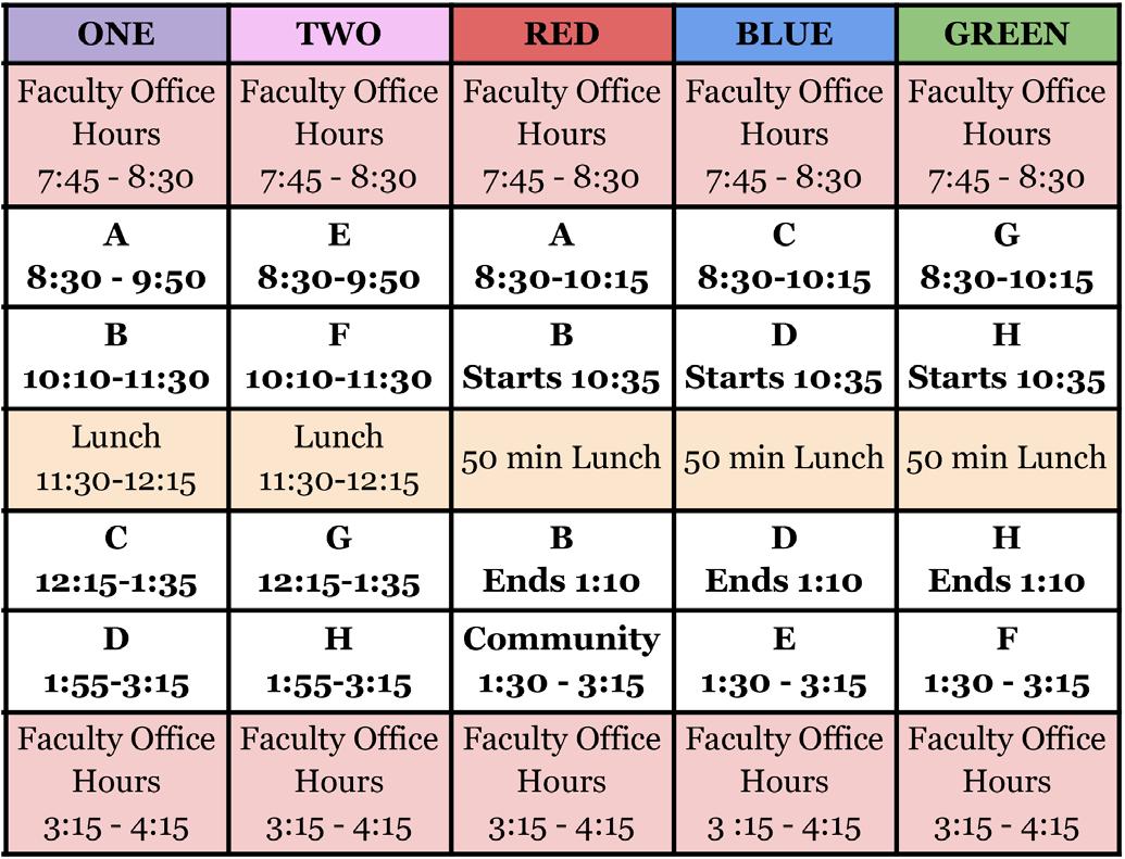 Convent & Stuart Hall follows a block schedule that rotates nine instructional periods over three days. Students generally enroll in six or seven academic classes and one of the scheduled periods is for co-curricular offerings, including time for clubs, advisory and community assemblies.
