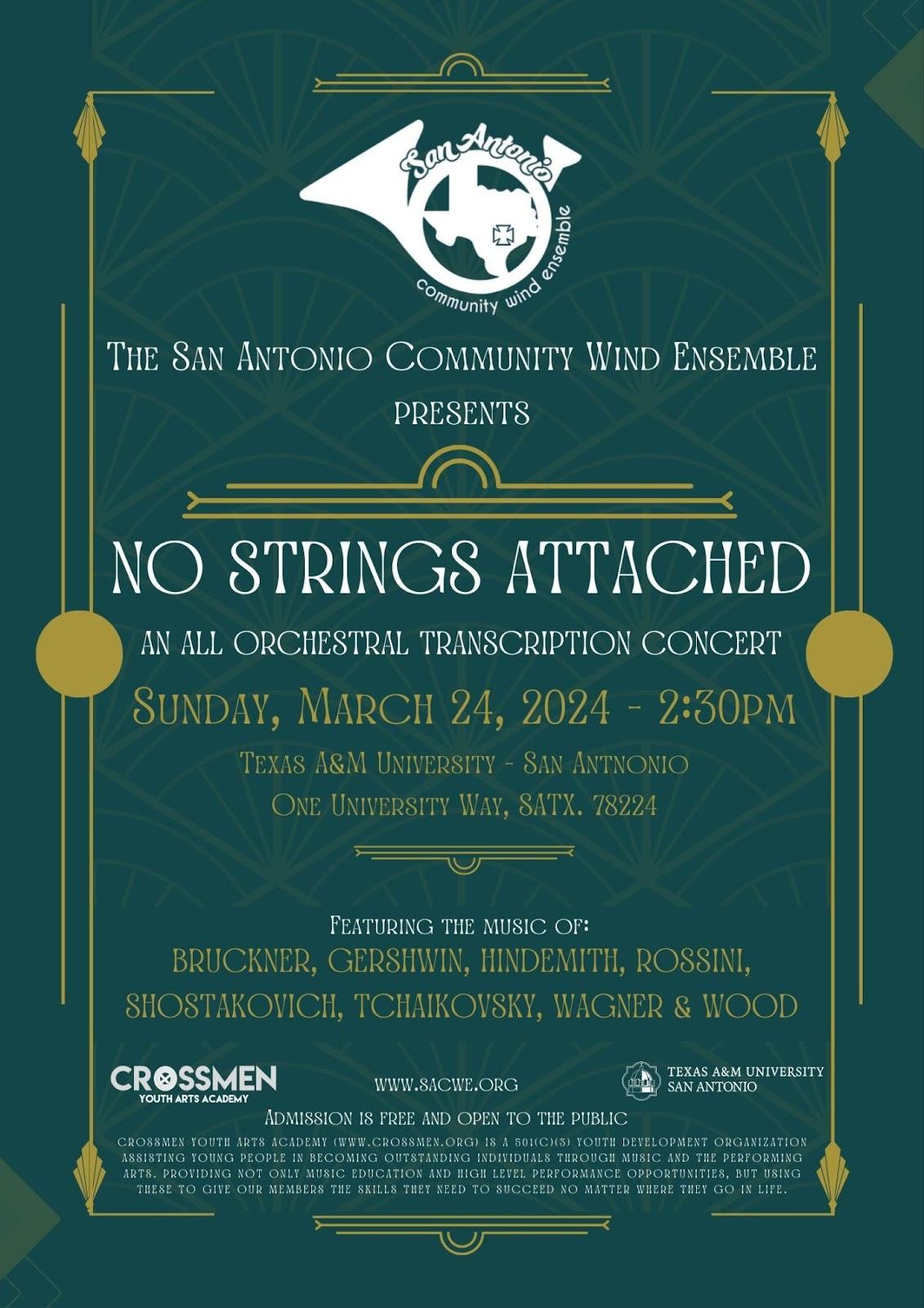 The San Antonio Community Wind Ensemble and the San Antonio Jazz Collective align their mission to that of Crossmen Youth Arts Academy by striving to enrich and shape the lives of young musicians and performers through the performing arts. Family, honesty, perseverance, dedication, independence, interdependence and excellence are taught and practiced by each and every member at Crossmen, SACWE and The Collective.