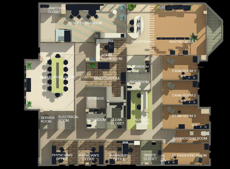 Vestibule, Reception, Administration Room, Bathroom, Exam Room , Mammogram Room, Ultrasound Room, Waste Closet, Clean Closet, Nurses' Station, Manager's Office, Physician's Office, Storage, Electrical Room, Server Room, Multipurpose Room, Fax/Printing Room, Staff Breakroom Program