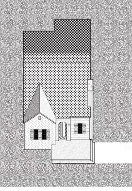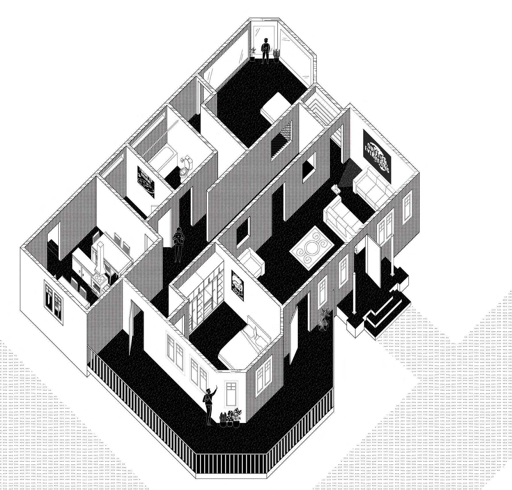 This oblique drawing was made through collaging existing CA bungalow floor plans to create a living space to house three eccentric characters: an 8 year-old exhibitionist, a 32 year-old conspiracy theorist, and a 84 year-old entertainer.