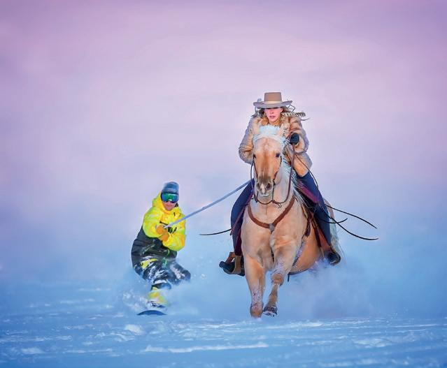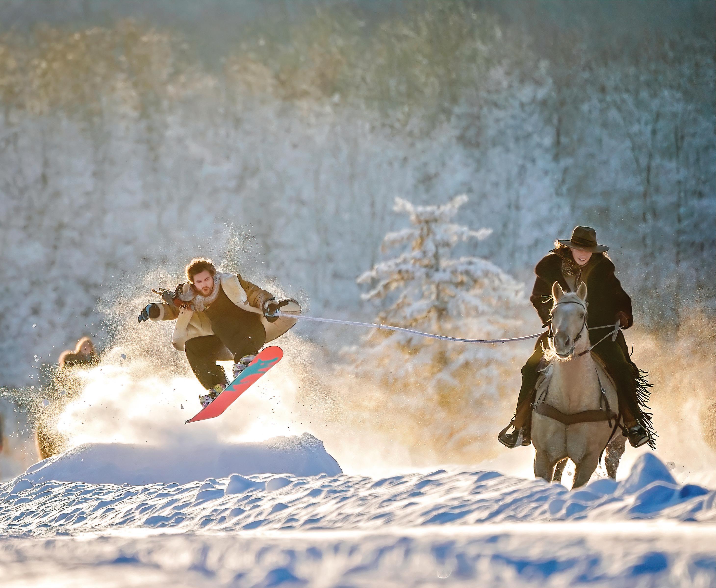arnessing the snow and cold and dressed in edgy frocks while noshing on steamy fondue is a crew of champion equestrians and medaled snow riders partaking in a truly captivating sport. Powdered snow is packed onto a carefully cultivated course of jumps and obstacles. Horses blaze a well-crafted trail, reshaping snowflakes they’ve kicked up as they run at top speed with the ambition of impressing an animated crowd. Spectators chomp at the bit to witness impressively fashioned skiers in tow behind the racing equestrians, slicing through a snow track before the horse’s top speeds launch skiers over a jump, instigating impressive tricks. This adrenaline-stoking event uniting athletes of differing breeds is called skijoring.