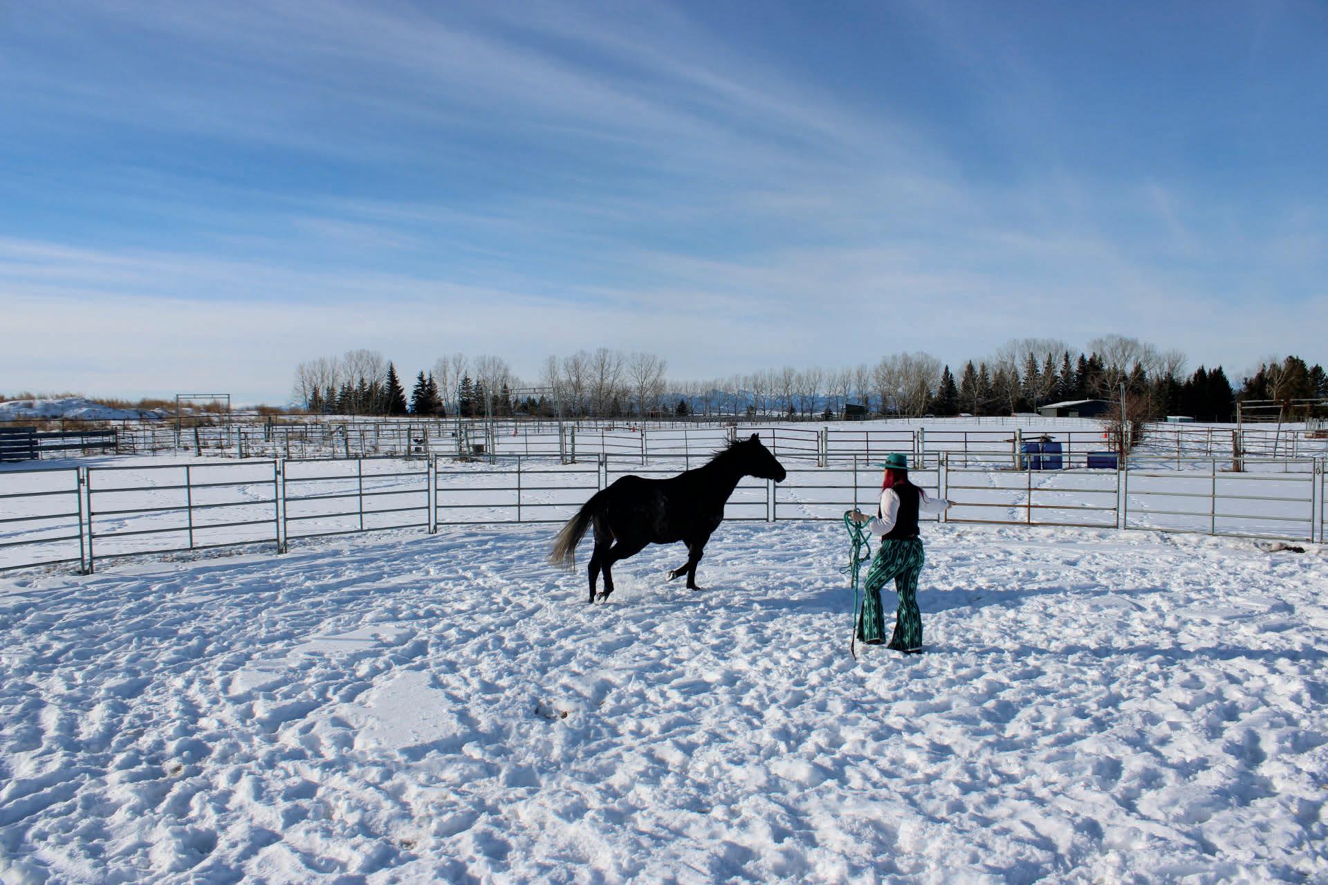 The camaraderie and amalgamation of people from differing walks of life is a large part of things for him, too. Gaucho is a thirteen-year-old Quarter Horse, described as very social, and Wolter’s go-to skijoring mount. This horse is outfitted with studded shoes for top performance on the snowy course. His love of running and attention from spectators when blazing through Banff is a highlight for Gaucho. Wolter indicates the importance of teaching the horses of skijor to not fear the rope, or the skier behind them, as they may feel like they’re being chased, or the slap of the rope can spook them. Since Gaucho is such a reliable horse, he and Wolter are typically paired with green snow-riders, or, due to Gaucho’s speed, they tow a skier that wants to do the big tricks and needs speed to line up for that. A funny