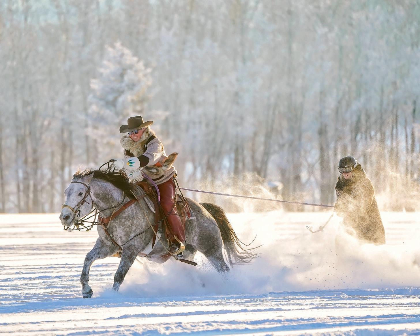 The seasonal sport of skijoring is quickly gaining traction for being a must-do winter exhibition for spectators and participants throughout North America. Skijoring, a Norwegian word for ski-driving, is believed to have originated in Scandinavia. In that part of the world, they hold a harness to ski behind horses, dogs, and even reindeer. Special to the North American style of skijoring is a rider on the horse with a skier or snowboarder in tow.