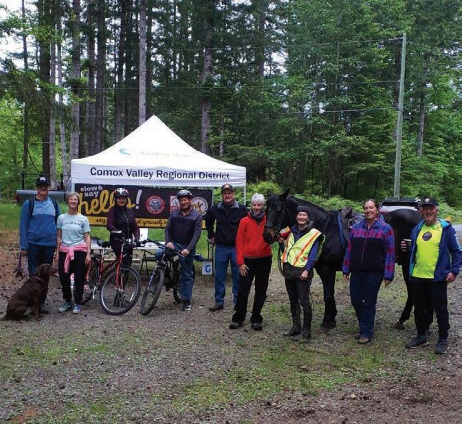 I contacted the Trail Partners Foundation and was connected to a volunteer named Curt Kruger. He provided names of several Canadian parks that had successfully adopted the program and offered to speak at a Back Country Horsemen of BC (BCHBC) Provincial Board meeting. He explained that all the use of the graphics, brochure, and artwork was free and available to be duplicated and edited for anyone to adopt. I decided to try this idea out at my local level first and, as the local BCHBC equestrian contact for the Regional District Parks Department, I contacted them first. They willingly shared their contacts for the local running group and the cycling coalition. Equipped with my laptop and some printed information, we met for coffee. Everyone liked the idea and we thought a joint banner would be a good start. A local company created a banner using the free artwork noted above, plus our three logos. Our groups held two collaborative events in our largest regional multi-use park. We brought horses, and each club had literature to hand out. We approached (i.e. gently accosted) trail users at the main intersection of the multi-user loop. We explained this simple idea – that ALL trail users should slow enough to say hello. We offered a gift card draw, and handed out lots of Horse Council BC brochures, pins, ribbons and unicorn duckies. (HCBC now offers grants for Trailhead events like this.)