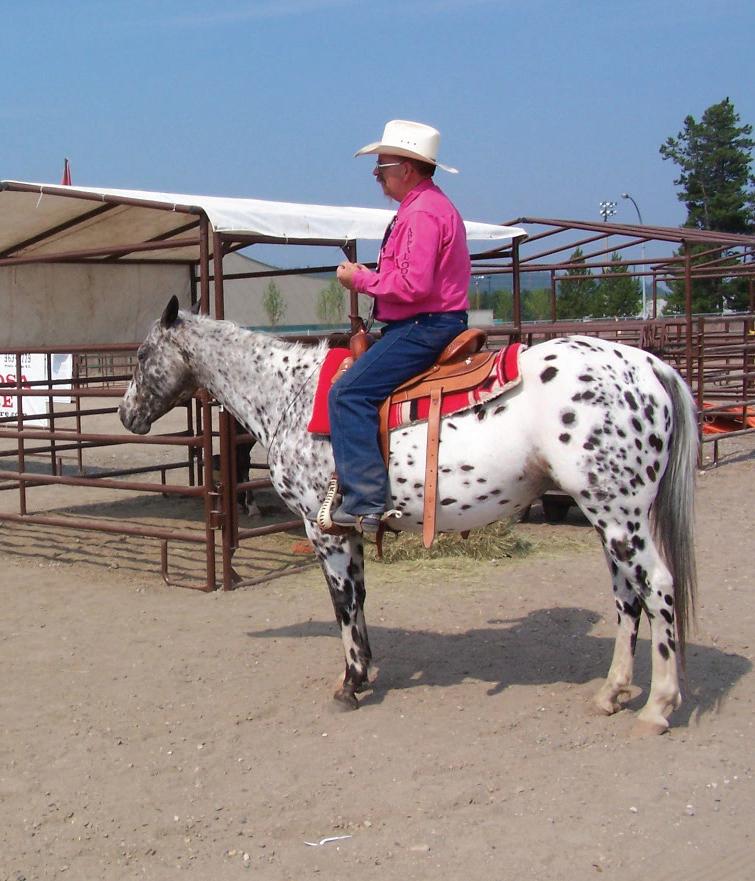 started her exhibition career as a yearling in the show ring at halter and the Appaloosa Breed example horse at the Calgary Stampede. At three she won 2 first place Buckles and a third place in large classes at the Prince George BC Ride & Slide. While raising a foal almost every year she accomplished many ApHCC National Top Ten Awards in Trail Horse, Most Colourful, Halter & National Superior Award in Trail. Many of her foals had show ring accomplishments but their main claim to fame is wonderful family friendly trail horses. Ninety Six was requested to be the lead horse in 31 performances of an Equine Opera at the PNE where she was observed by a reported 128,000 spectators. Now retired to being the yard supervisor and carrying the old guy on the occasional trail ride / fence inspection. She still knows she is the Queen!
