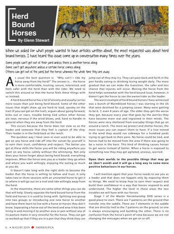 s usual the best question is: “ Why can’t I ride my horse away from the herd?” The answer is… the horse is more comfor table, trusting, secure, interested, and feels safer with the herd than with the rider. We need to switch this around so that the horse feels these things with us instead. A herd bound horse has a lot of anxiet y and usually carries more issues than just being herd bound. Some of the other issues that might show up are hard to load, spook y on the trail (if you can get on the trail), argues about going for ward, kick s out or rears, trouble being tied unless other horses are near, ner vous if the wind blows, and, hard to handle in general when they are away from the herd. This occurs because the horse does not view us as the leader and someone that they feel is captain of the ship. Their leader is in the f ield back at the ranch. The quickest way I have seen or ever used to be able to get on any horse and ride of f into the sunset by yourself is to earn their trust, conf idence and respect. The better you get at these skills the faster you will be riding any where you want on any horse calmly without the whinnying. Not only does your horse forget about being herd bound, ever y thing improves. When the horse sees you as a leader they go when and where you want willingly, enjoying the outing as much as you do. It doesn’t take long with the right skills to become the leader that the horse is willing to follow and trust. It only takes two or three sessions with an unstar ted horse to get it to where it will go out on a trail and ride willingly away from the herd. In the meantime, there are some other things you can do that will help. Slowly separate the herd bound horse from the f ield and horses it is used to living with. Splitting one group into two groups or introducing one new horse to another and have them learn to live with a horse or horses they don’t know. Separating a horse out of the herd and area it has been living in and moving it to another area or pen without any of its pasture mates it ver y stressful for the horse. They can get so worked up that if they are in a pen that they think they can 6 • August 2019