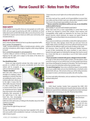 RULES OF THE ROAD Here’s what the Motor Vehicle Act has to say about equestrian traffic: Part 3, section 119, paragraph (1) “traffic” includes pedestrians, ridden or herded animals, vehicles, cycles and other conveyances, either singly or together, while using a highway to travel” Part 3, section120, paragraph (1), sub-paragraph (c) “a person riding an animal or driving an animal driven vehicle on a highway has the rights and is subject to the duties of the driver of a vehicle under this Part” You should know that: Horses are large powerful animals that often weigh over 1000 pounds so a collision with one poses considerable risk to the motor vehicle and its occupants, as well as to the horse and rider. * Road or shoulder? Note that when riding on the shoulder of a roadway, a rider is signalling to motorists that they are yielding the road (i.e. when a motorist pulls their vehicle over to the right, it means that the other traffic may pass). However if a rider is having difficulty or is unsure of their horse, as with an inexperienced horse, legally they may remain in the roadway indicating their possession of the right-of-way in the righthand lane, thus encouraging vehicles to pass in the left hand traffic lane when safe to do so. If riding on the shoulder, stay as far off the roadway as possible. * Fact vs. Fiction “Horses have the right-of-way over cars.” FALSE! The law that stated such has long since been repealed. In BC, anyone who uses a public road is considered a “road user,” so the days of ultimate right-of-way are gone! HCBC 2010 BUSINESS OF THE YEAR