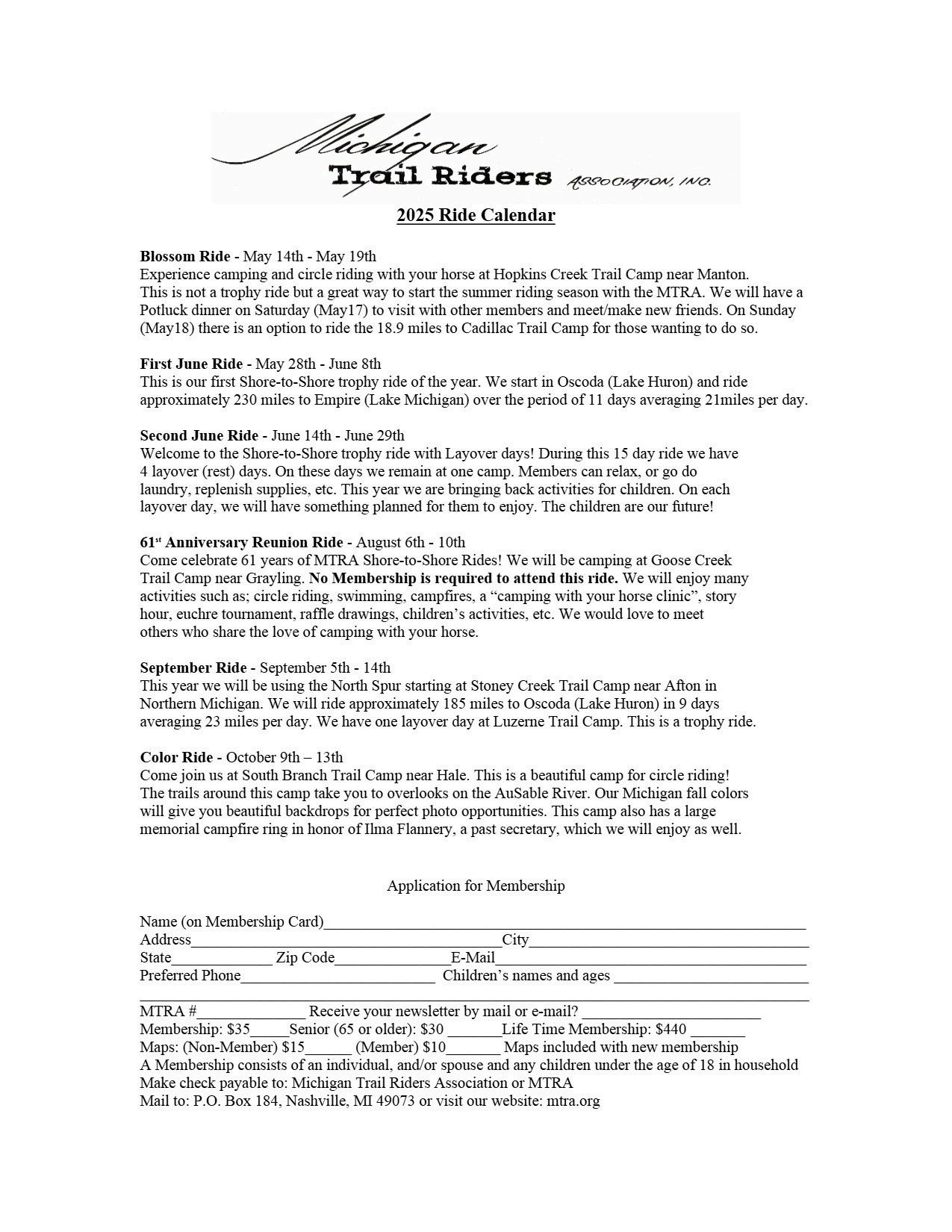 May 23-26, 2025: Memorial Day Weekend Sleep Hollow Trail Riders Camp Over Saturday poker run and potluck Call Marsha Putnam at 989277-8544.