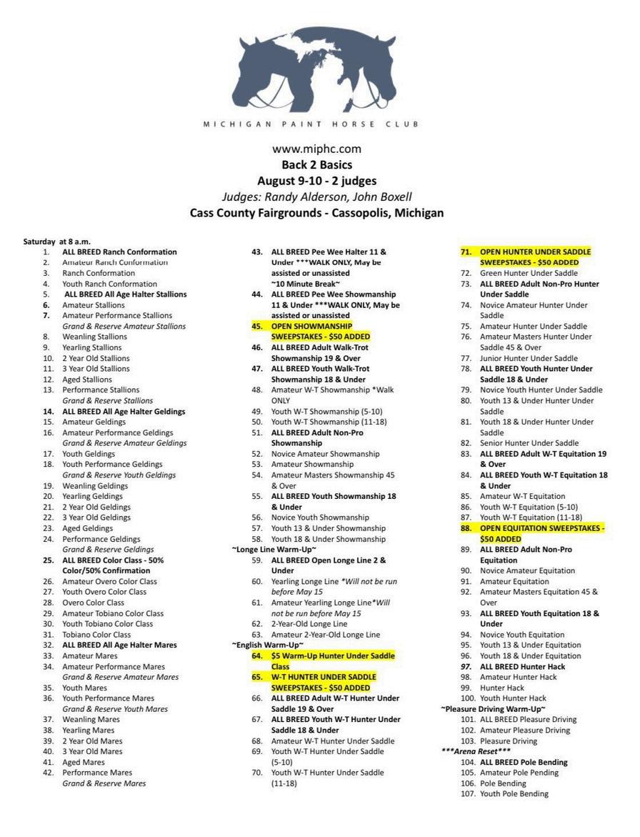 September 6, 2025: Pine Lake Stables September Dressage Show. Plainwell, Michigan Online entries available at pinelakestables com Entries deadline is August 28, 2025
