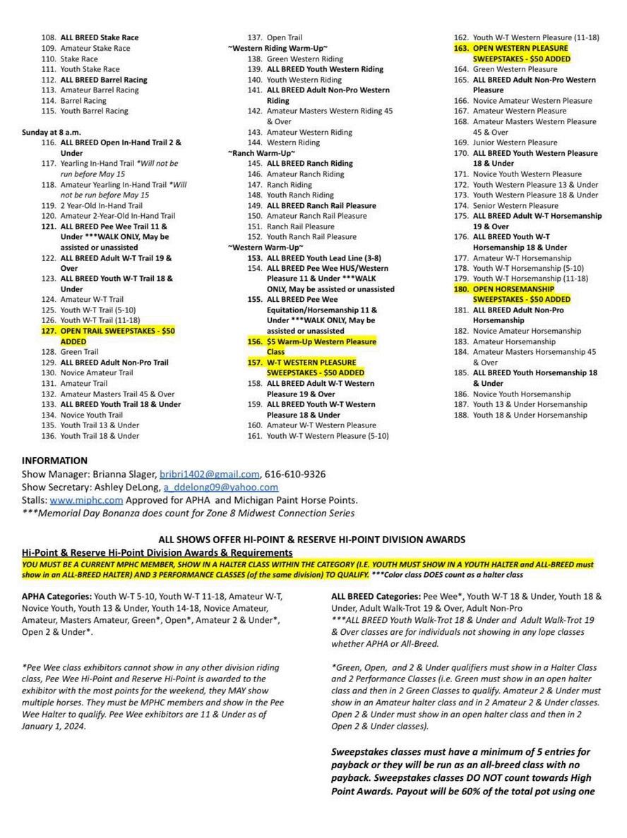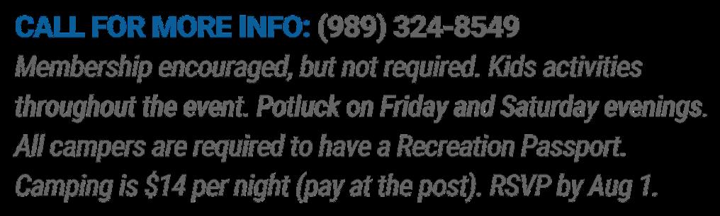August 29 - September 1, 2025: Labor Day Weekend Sleep Hollow Trail Riders Camp Over Saturday poker run, potluck campfire Call Marsha Putnam at 989-277-8544.