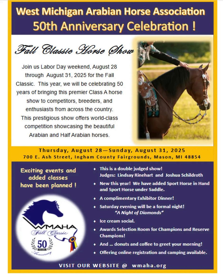 September 27, 2025 Fall Horseshoe Hunt Trail Ride. Silver Creek Equestrian Campground 3900 134th Ave. Hamilton MI 49419. Questions Kaitlynn Tuckey 810-614-1468 kait tuckey@yahoo com Facebook: The Walking Horse Association of Michigan
