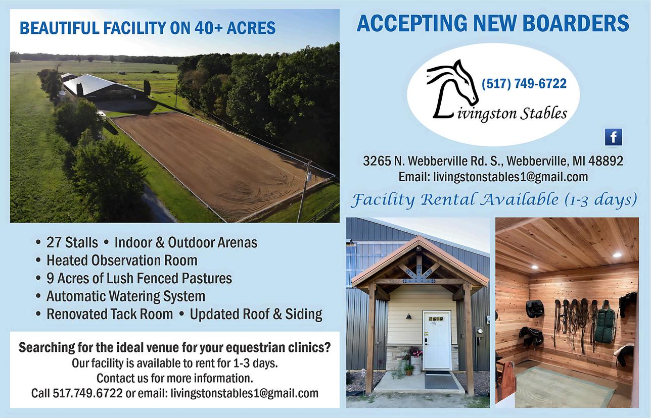 HORSE/TACK AUCTION: First Saturday of each month (except July) Tack 2pm, Horses after 6pm Consignments welcome Northern Michigan Livestock, 1848 N Townline Rd. Gaylord, MI. Office 231.439.5679. Find us on Facebook northernmichiganlivestock.com