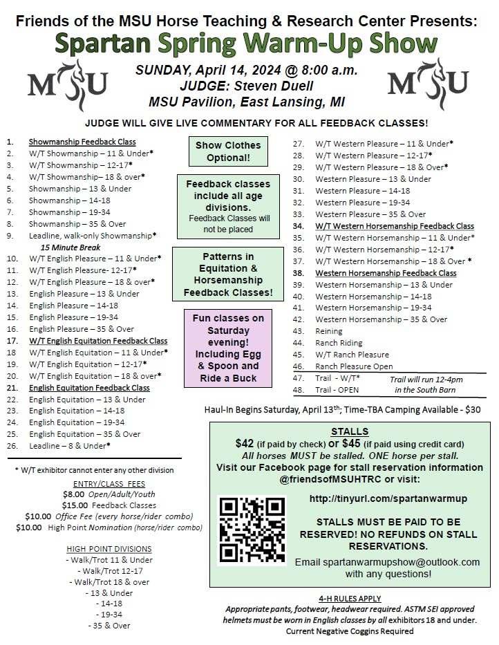Stalls Reservations: mabcstalls@gmail.com or 517-655-4712 • Find Us On Facebook: Michigan Apple Blossom Classic 7 PM Friday Trail Classes 57-62 • 8 AM Saturday/Sunday Classes 1-56 • Arrival Starting Noon Friday – NO EARLY ARRIVALS