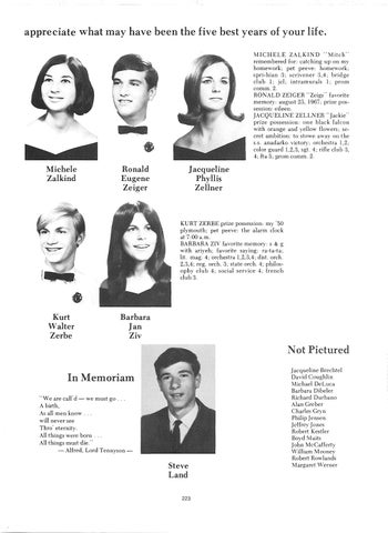 appreciate what may have been the five best years of your life. MICHELE ZALKIND "Mitch" remembered for: catching up on my homework; pet peeve: homework; spri-hian 3; scrivener 3,4; bridge club 1; jcl; intramurals 1; prom comm.2. RONALD ZEIGER "Zeigs" favorite memory: august 23, 1967; prize possession: eileen. JACQUELINE ZELLNER "Jackie" prize possession: one black falcon with orange and yellow flowers; secret ambition: to stowe away on the s.s. anadarko victory; orchestra 1,2; color guard 1,2,3, sgt. 4; rifle club 3, 4; fta 3; prom comm. 2.