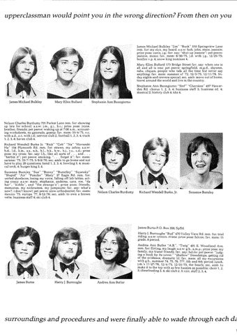 Nelson Charles Burdumy 701 Parker Lane rem. for: showing up late for school: a.s.w: j.m., g.j .. h.c.; prize poss: joyce, heather, friends; pet peeve: waking up at 7:00 a.m., accounting worksheets, no gatorade, gossip; fav. mem: 10/4/75, o.c. with a.d., o.c. with j.d.; service club 2; football 1, 2, 3, 4; track 1,2, 3,4; haven club 4. Richard Wendell Burke Jr. "Rick" "Cob" "Na" "Havasaki Ha" 154 Plymouth Rd. rem. for: straws, my zebra; a.s.w: b.d., l.d., k.m., S.S., n.h., b.l., b.k., b.w., b.j., r.c., c.d.; prize poss: my cross; fav. say: l.b., like all sorts of . . . and . . . "herbin it"; pet peeve: smoking, ". . . forget it"; fav. mem: saranac '75, 10/7/75, 5/6-9/76; sec. amb: to go home and not have to play 20 questions; band 1, 2, 3,4; bowling 3, 4; musical orch. 4; burger king 3, 4. Suzanne Burnley "Sue" "Boozy" "Burntley" "Squeaky" "Stupid" "Air" "Poncho" "Mary" 37 Eagle Rd. rem. for: united shoelaces, losing my voice, falling off lab tables, acting crazy; a.s.w: mary, stephanie, anderea. cara, roe, "da har", "kiddo", and "the strango's"; prize poss: friends, memories, my nicknames, my jumpsuits; fav. say: what's new?, i don't know!; pet peeve: slow orthodontist; fav. mem: mexico '75, europe '77, 8-12/76; sec. amb: to own a brown vette; business staff 4; ski club 4.
