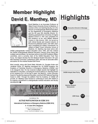 David E. Manthey, MD David Manthey is an Associate Professor at Wake Forest University School of Medicine. A member of the core teaching faculty, he is the Director of Undergraduate Medical Education for the Department of Emergency Medicine and the 4th year EM clerkship director. Dr. Manthey graduated from University of Virginia Medical School in 1991 and completed his EM residency at the Joint Military Medical Centers in San Antonio 1995. He served as both clinical faculty and research director at Brooke Army Medical Center, until 1999, when upon completing his military commitment, he settled at Wake Forest University School of Medicine. Dr. Manthey has been active with SAEM undergraduate medical education since 1999, and has chaired the SAEM Undergraduate Medical Educators Interest Group along with multiple subcommittees. He has been active in the ACEP Academic Affairs committee, and is currently chair of the SAEM Education Fund Task Force. He helped develop the first Medical Student Educators’ 4th year EM Clerkship Curriculum, published in 2005, and was an associate editor and author for the medical student EM Primer. Most recently, along with David Wald, Michelle Lin, Douglas Ander and Jonathan Fisher, Dr. Manthey developed the 1st SAEM Academy, the Academy of Clerkship Directors in Emergency Medicine (CDEM), and is its inaugural chair. He has received multiple awards that highlight his dedication to education, including the local Excellence in Teaching Award at his residency for 6 of the last 8 years, the Merrill A. Cohen Honorary Award in Faculty Development Education, and the ACEP National Teaching Award in 2002. Through the platform that the Academy of CDEM will provide, Dr. Manthey looks forward to continuing to work with SAEM on its ongoing commitment to undergraduate medical education and faculty development.