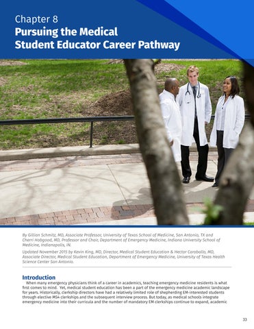One of the major advantages for the academic physician involves the opportunity to educate residents, medical students, as well as fellow colleagues and coworkers� Academic emergency physicians also have the opportunity to travel, lecture, contribute scholarly work, perform research, and serve as training mentors for future generations of emergency physicians� Academic emergency physicians will often have scholarly requirements in addition to their clinical duties� Previously, an academic physician may have worked in an environment where he or she would have to “publish or perish” on a traditional clinical-research track� However, many institutions have created additional pathways for promotion in academic medicine in addition to the traditional clinical researcher route� A hybrid “clinical educator” promotion track, for example,