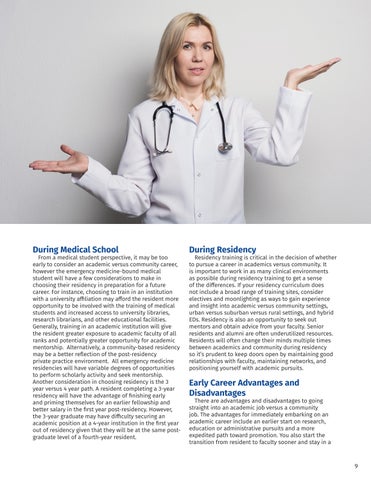 From a medical student perspective, it may be too early to consider an academic versus community career, however the emergency medicine-bound medical student will have a few considerations to make in choosing their residency in preparation for a future career� For instance, choosing to train in an institution with a university affiliation may afford the resident more opportunity to be involved with the training of medical students and increased access to university libraries, research librarians, and other educational facilities� Generally, training in an academic institution will give the resident greater exposure to academic faculty of all ranks and potentially greater opportunity for academic mentorship Alternatively, a community-based residency may be a better reflection of the post-residency private practice environment� All emergency medicine residencies will have variable degrees of opportunities to perform scholarly activity and seek mentorship� Another consideration in choosing residency is the 3 year versus 4 year path A resident completing a 3-year residency will have the advantage of finishing early and priming themselves for an earlier fellowship and better salary in the first year post-residency� However, the 3-year graduate may have difficulty securing an academic position at a 4-year institution in the first year out of residency given that they will be at the same postgraduate level of a fourth-year resident