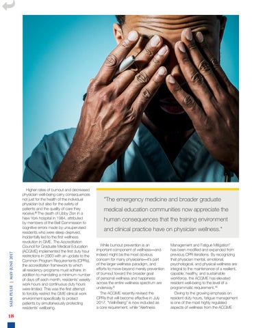 Management and Fatigue Mitigation” has been modified and expanded from previous CPR iterations. By recognizing that physician mental, emotional, psychological, and physical wellness are integral to the maintenance of a resilient, capable, healthy, and sustainable workforce, the ACGME has elevated resident well-being to the level of a programmatic requirement.10 Owing to the growing emphasis on resident duty hours, fatigue management is one of the most highly regulated aspects of wellness from the ACGME