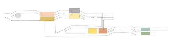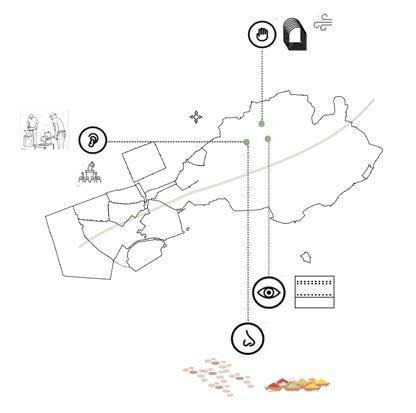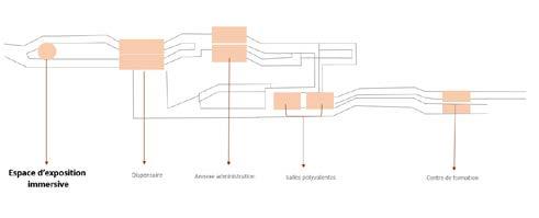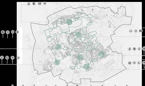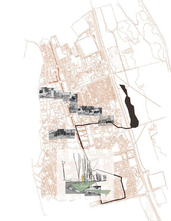 Ce parcours donnera naissance à de nouveaux noyaux d'activité sociale, économique et administrative selon les necessités relevées, l'idée est de pourvoir apporter une logique urbaine au projet et completer le schema narratif du parcours. Ces noyaux actifs seront composé comme sur la carte ci après: