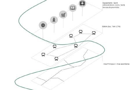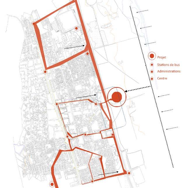 Ces équipements émérgeront à partir de la linéarité du parcours, de telle sorte à préserver la continuité du projet et à donner l'illusion de ligne de conduite vécue. Le projet naitra donc à partir de la ligne du parcours et sera guidé par son axialité, l'objectif est de garder l'usager dans l'environnement immédiat et de ne pas embrouiller pl'objectif premier du projet étant d'offrir une logique conductrice simple, lisible et facile à l'accessibilité de la ville.