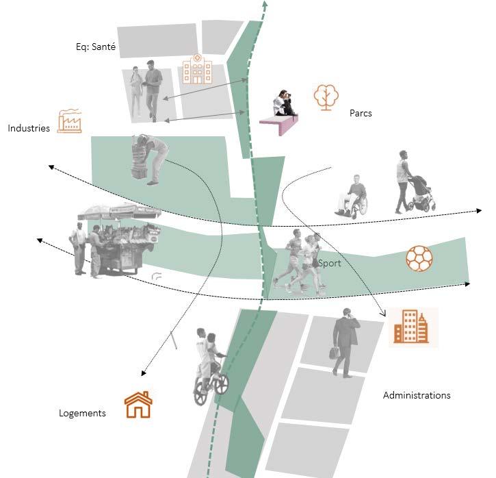 Le parcours, par sa simple existance, réagira à ce besoin et montrant la possiblité d'accèder aux secteurs pricipaux de la ville sur la forme d'un ligne adapté et adaptable.
