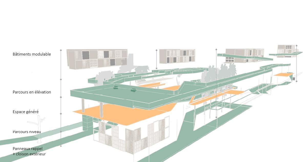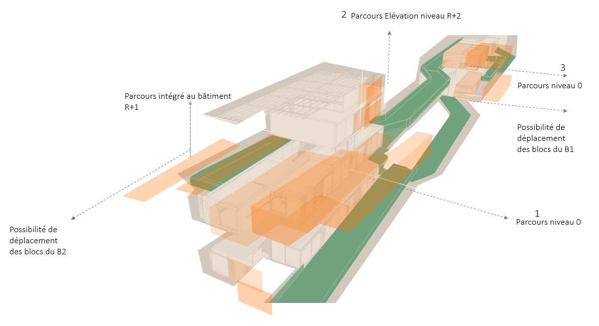 Un parcours modulable, adaptable, qui peut changer en fonction des situations et des necessités, c'est l'objectif principal du projet, car comme il se présente comme une réponse à 'accesibilité de la ville, il se doit d'être à l'image du caractère mouvant du developpement urbains des villes qui engendre souvent le changement des schéma d'accès et des liaisons piétonnes et cyclables. Aujourd'hui à Fes, on constate une émérgence de nouveaux moyens de transports par exemple, quisont les trotinettes éléctriques, ce changement entraienera la necessité d'y adapter la ville. La modularité est donc nécessaire dans l'articulation de ce projet, et elle doit s'operer sur tous les composantes du projet, architecturaux aussi.