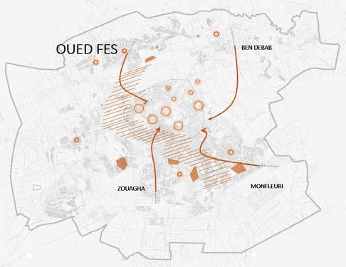 Le zoom s'operera au niveau du quartier Oued Fes, c'est l'un des quartiers les plus anciens et les plus structurant de la ville, il est en developpement constant et observe une insuffisance entre son nombre d'habitants et les équipements necessaires. On observe sur la carte l'ampleur des bulles de densité (121-180hab/ha) par rapport aux équipements. Il s'agira donc d'y apporter un équilibre socio-écomique et urbain à travers la mise en place du projet, qui sera permutable.