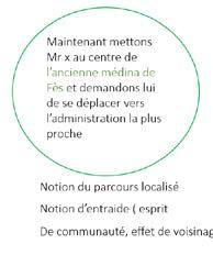 Le parcours émérgera des anomalies soulevées dans le quartier de Oued Fes, en apportant un cheminenement logique dans les artères principales et en arrivant à un point d'arrivée qui sera le projet architectural consituées des differents noyaux d'activités qui seront eux même ancrés dans le parcours.