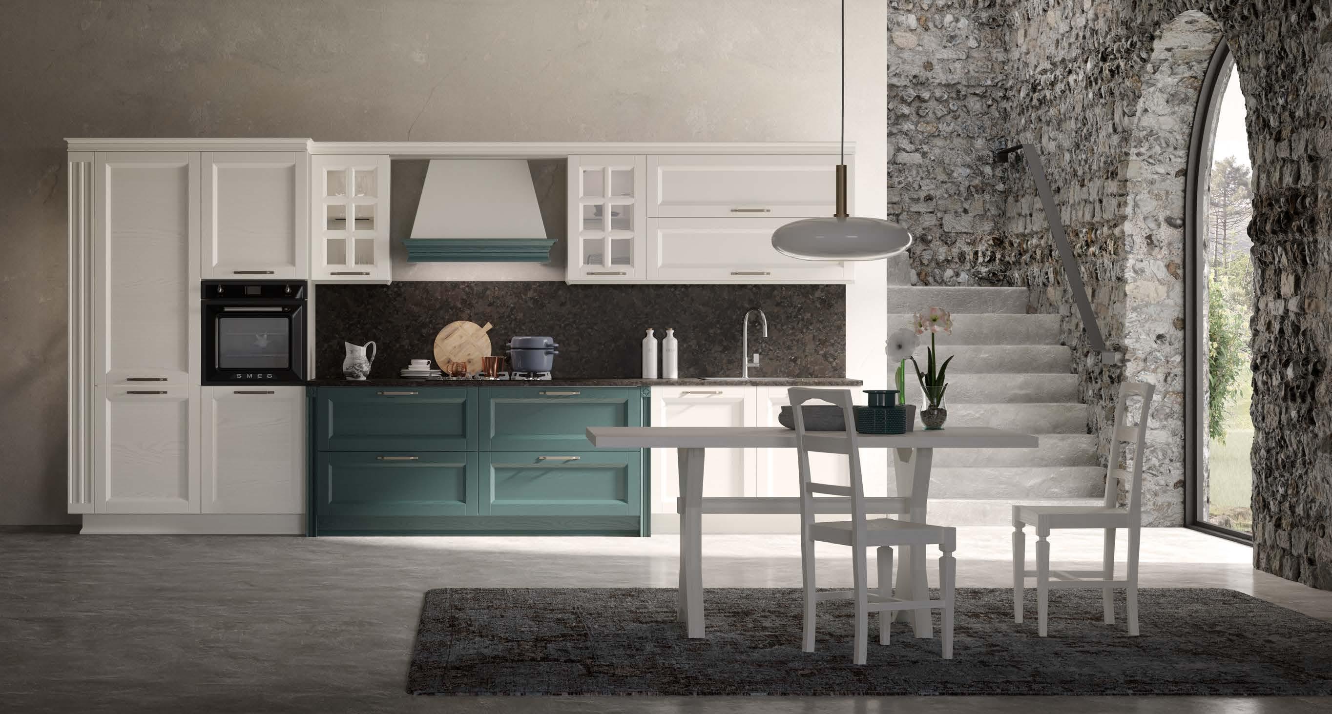 Composizione ad angolo con penisola, ricca di personalità sottolineata dagli elementi caratterizzanti, come le ante lisce in Frassino laccato in finitura Malachite, la cappa con frontale sagomato e le colonne con terminale decorato.