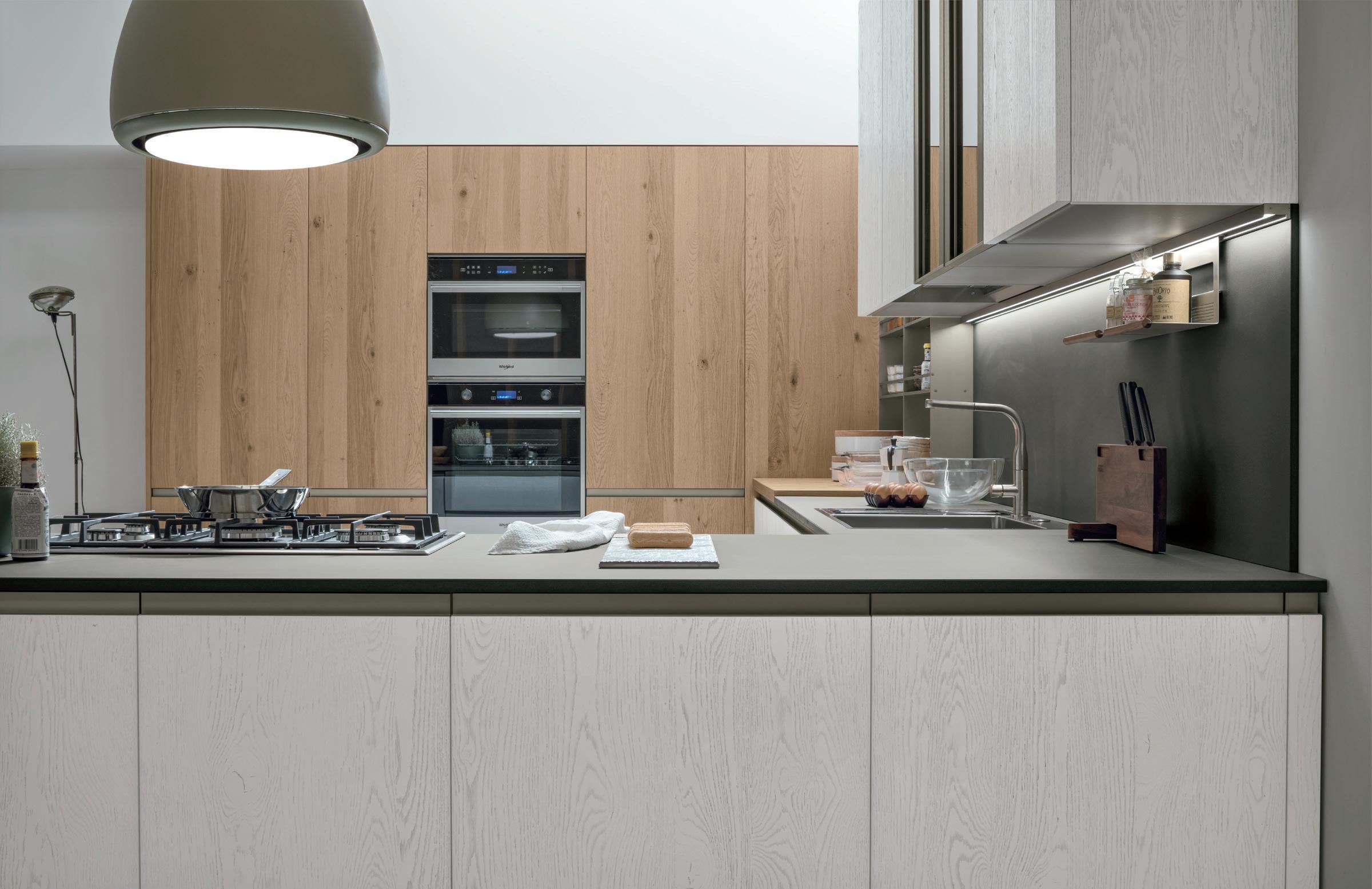 The warmth and naturalness of wood are enhanced via innovative design solutions. Natural mixes elements and finishes, creates dynamic volumes and brings kitchen and living spaces together into one environment, using open spaces and flowing passages that allow the two spaces to communicate constantly with one another also via a perfect continuity of style.