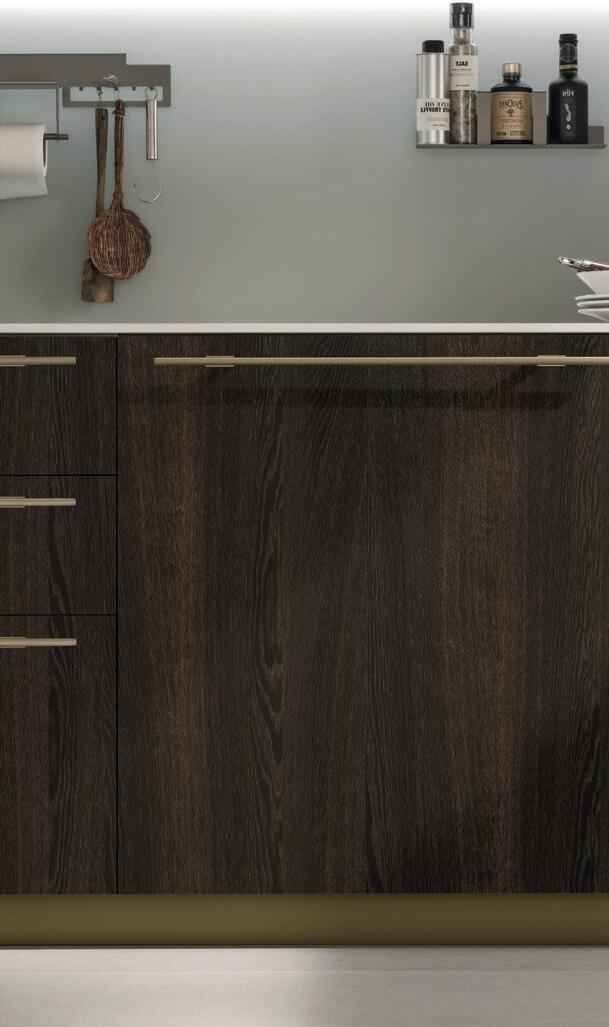 La finitura bronzata é disponibile per gola, nuova maniglia godronata e zoccolo. Si abbina con raffinatezza ai nuovi materiali Evolution System per creare composizioni con effetti materici e tattili esclusivi.