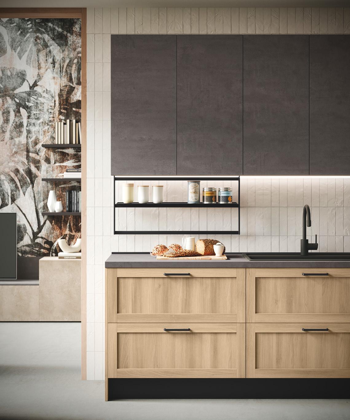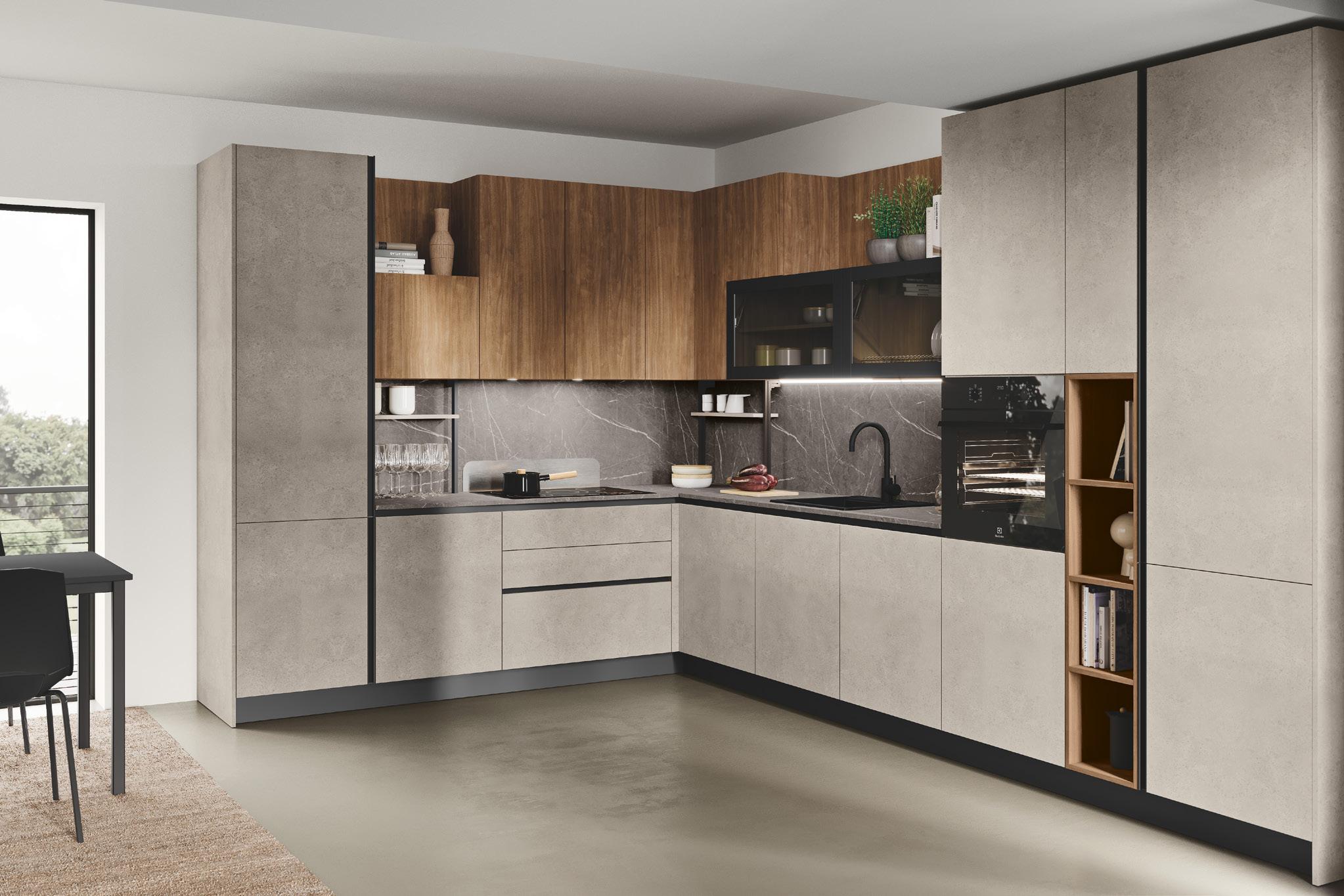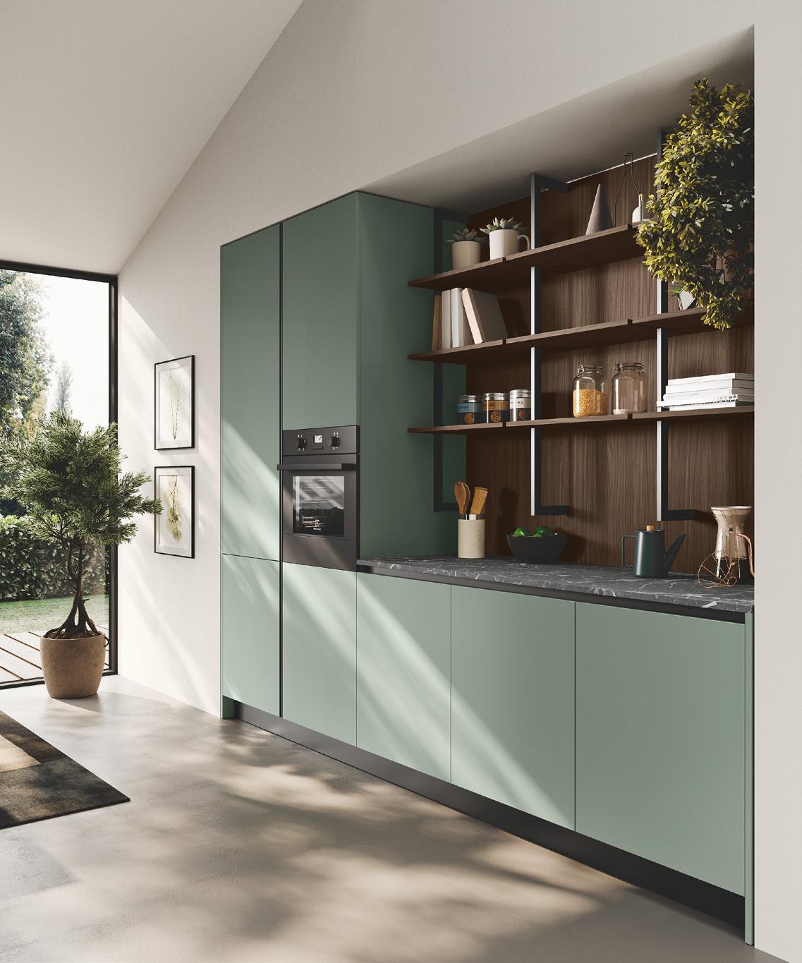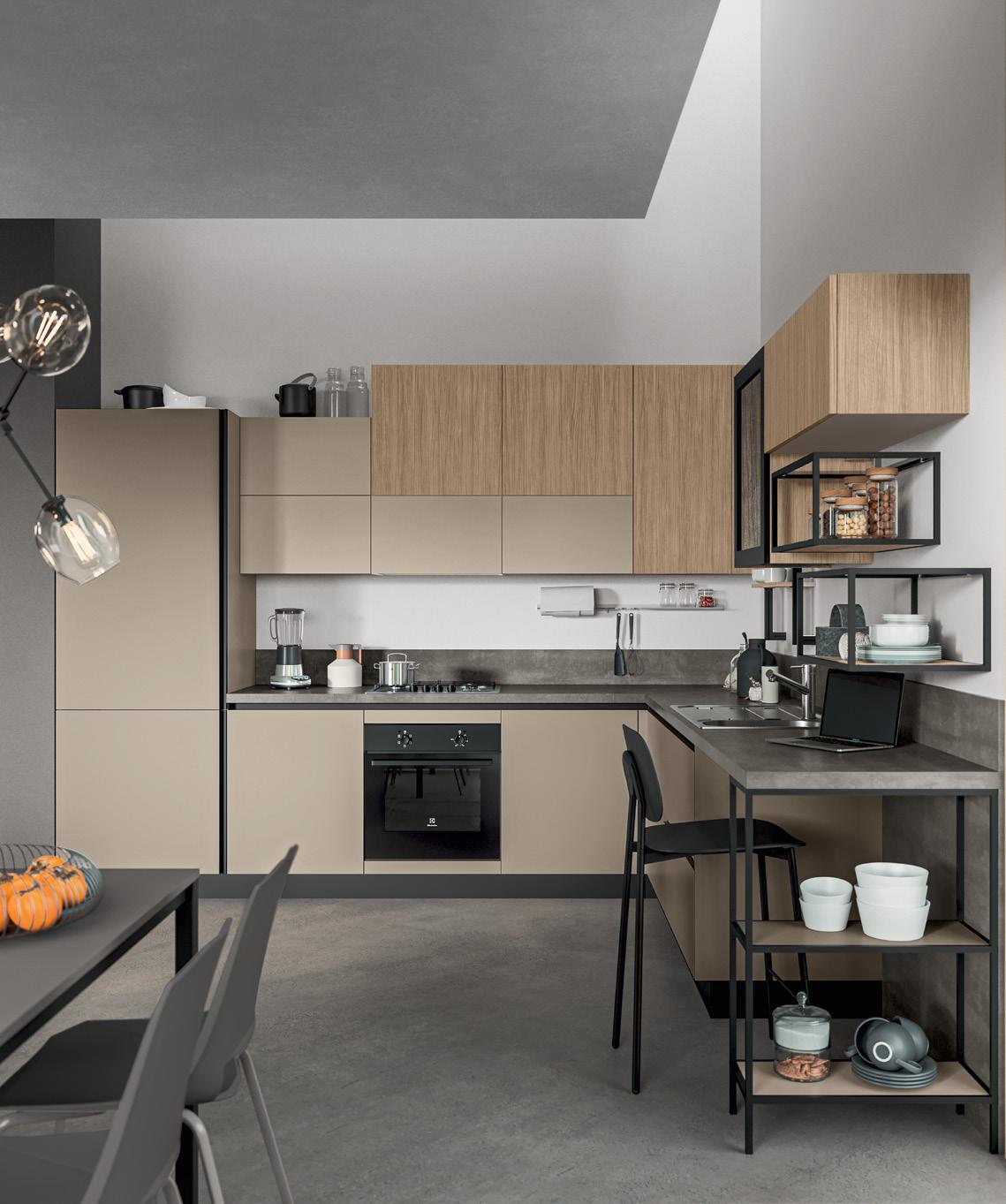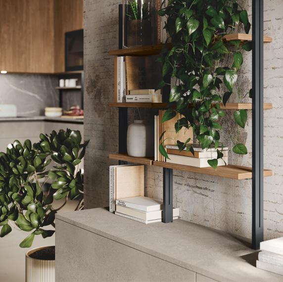Basi basse e piano in nobilitato opaco finitura Siena, modulo a giorno Jolly e mensole in finitura Vulcan.
