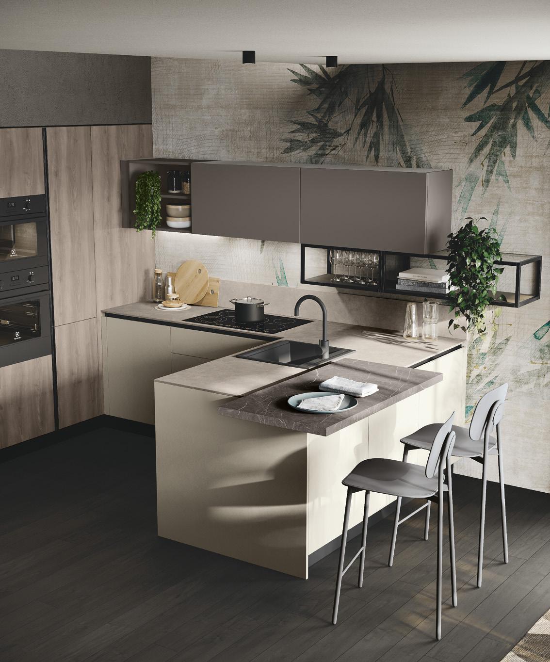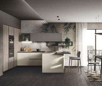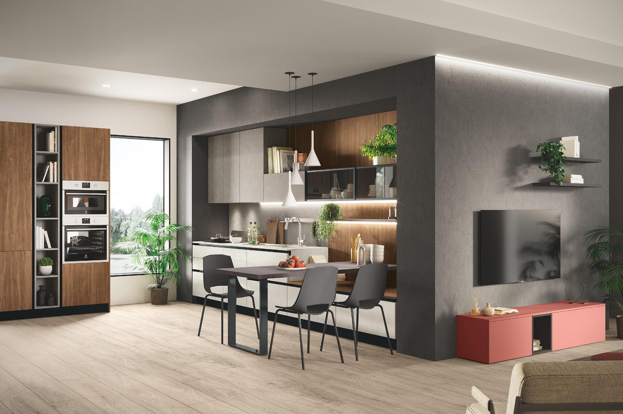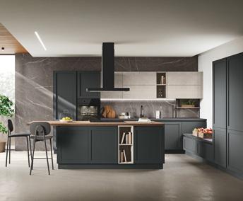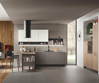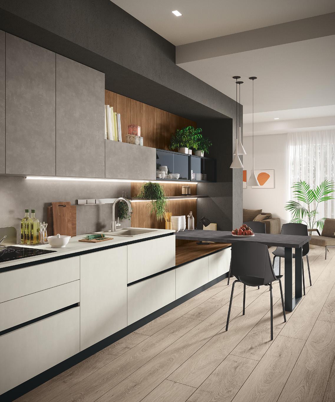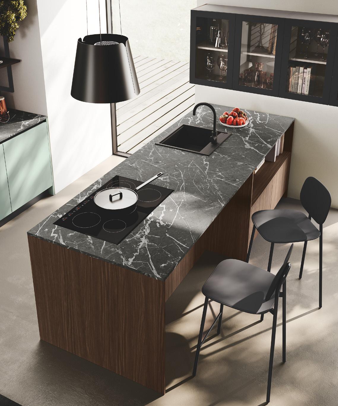 Ces lignes simples et claires inspirent un environnement domestique dans lequel tout se combine pour créer des moments inoubliables avec la famille et les amis. L’environnement est caractérisé par un mur central autour duquel se développent des armoires et des espaces de vie. Les éléments hauts sont façonnés pour permettre à la cuisine de se transformer d’un espace dédié à la préparation des aliments en un espace repas.
