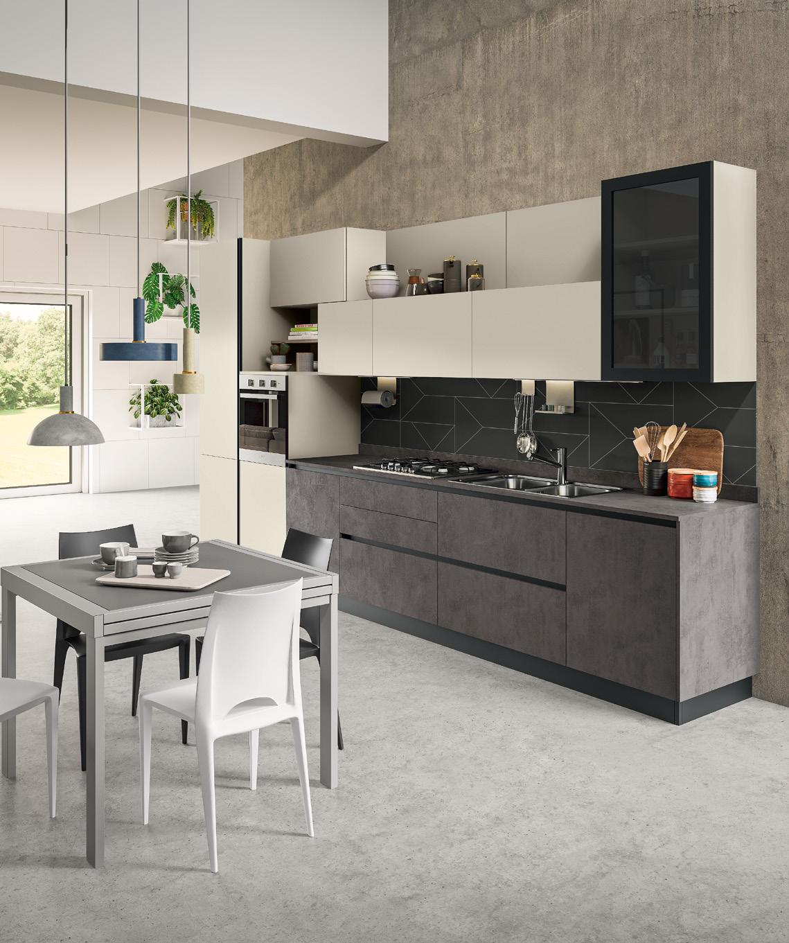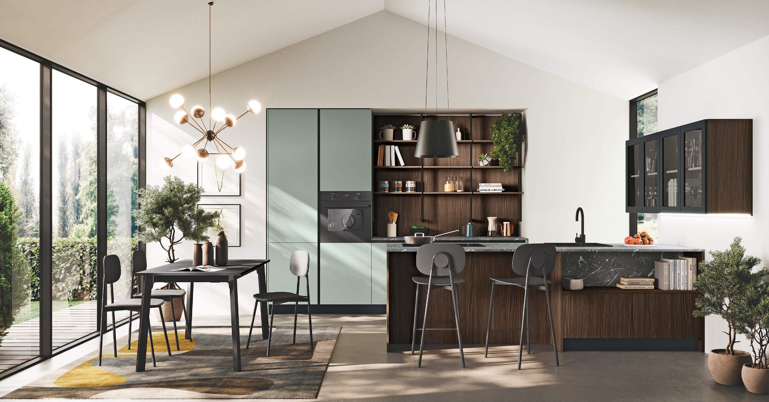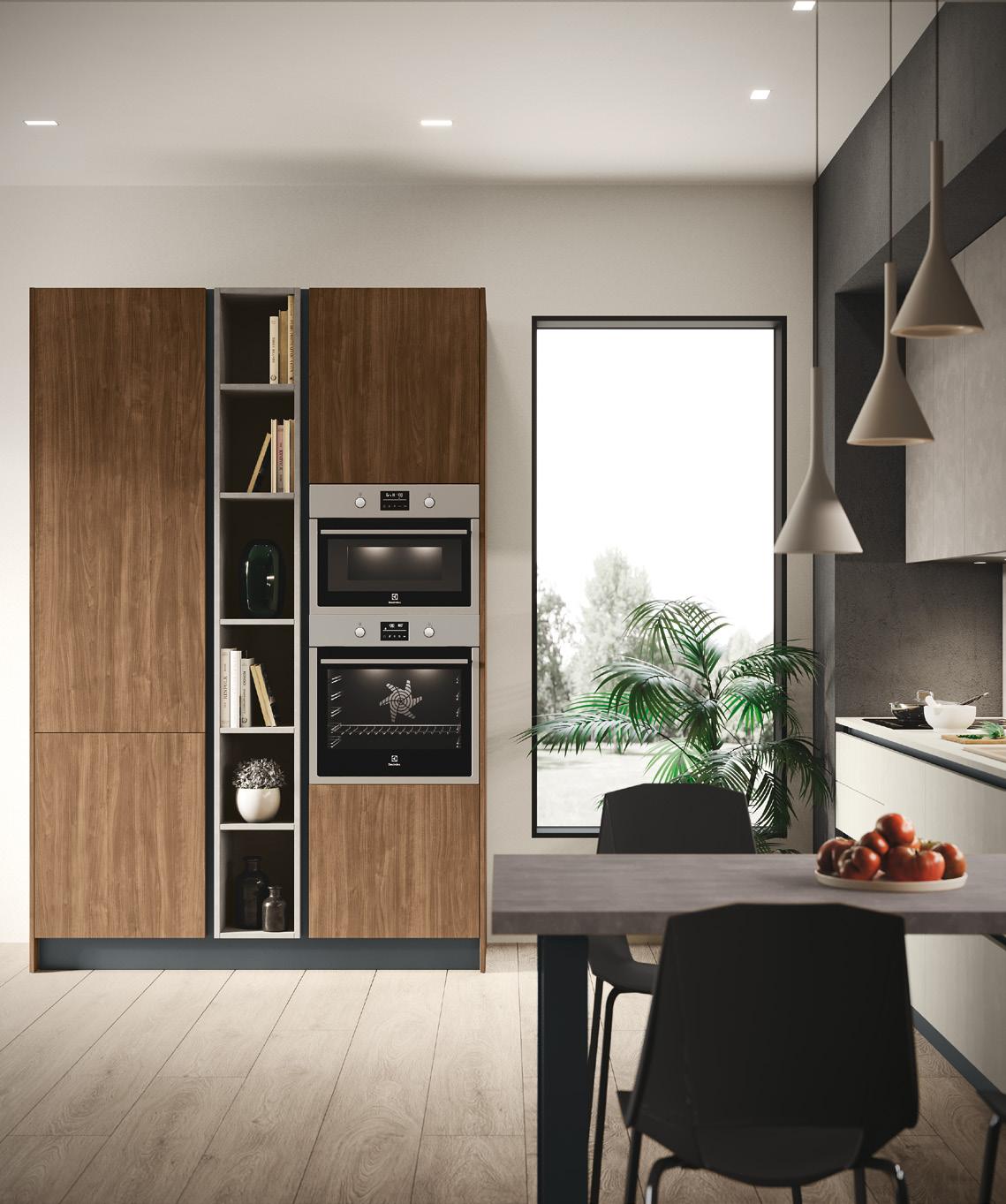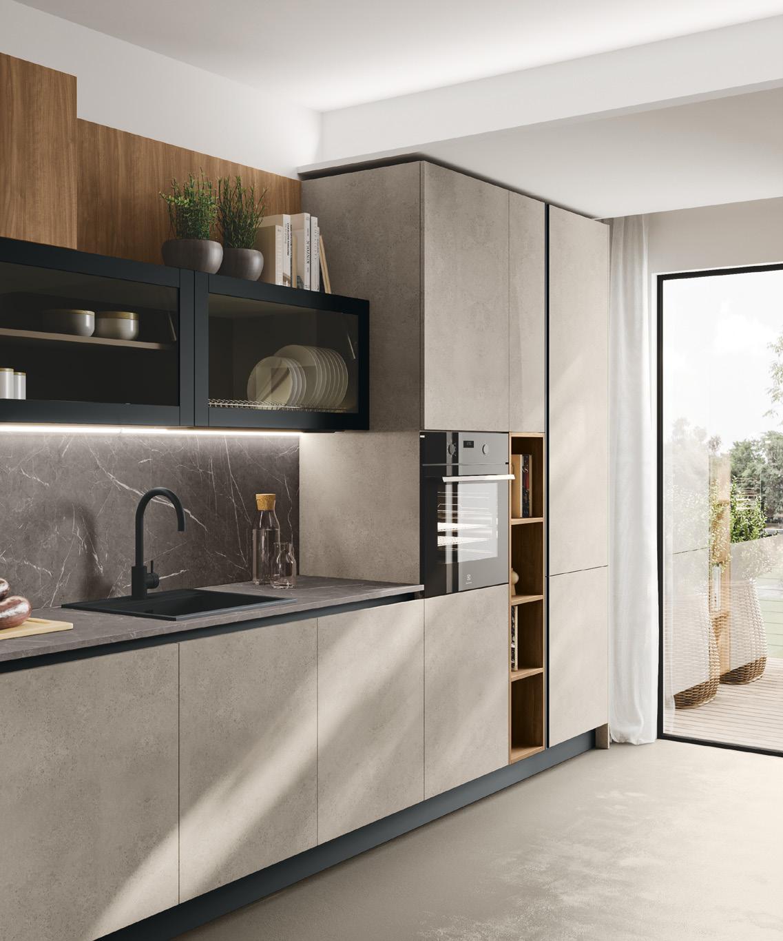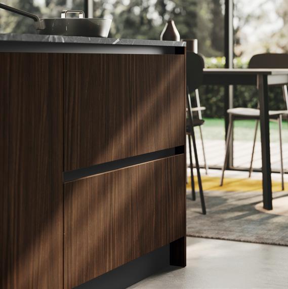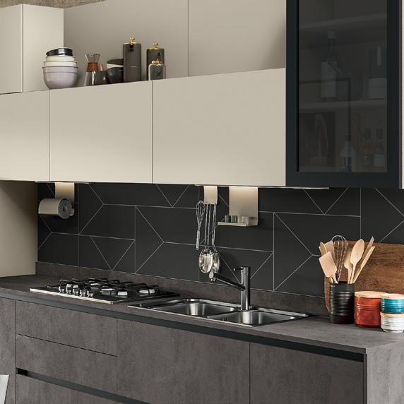 Ces lignes simples et claires inspirent un environnement domestique dans lequel tout se combine pour créer des moments inoubliables avec la famille et les amis. L’environnement est caractérisé par un mur central autour duquel se développent des armoires et des espaces de vie. Les éléments hauts sont façonnés pour permettre à la cuisine de se transformer d’un espace dédié à la préparation des aliments en un espace repas.