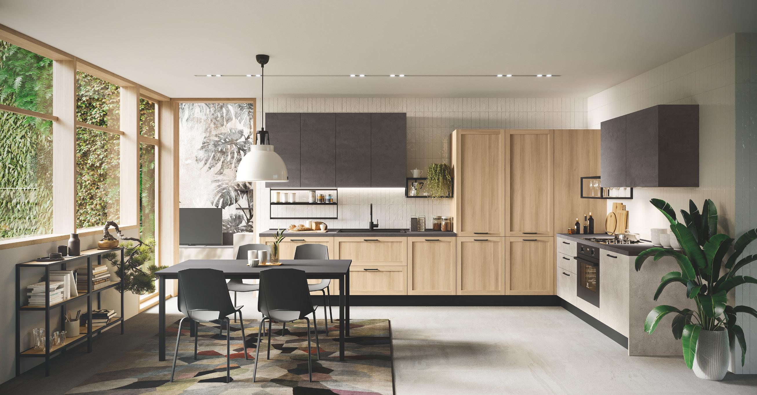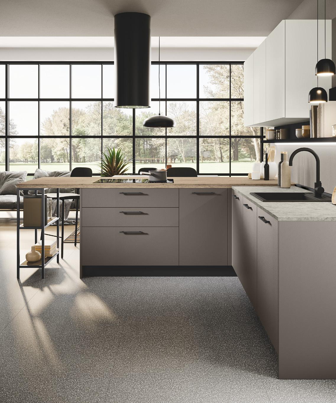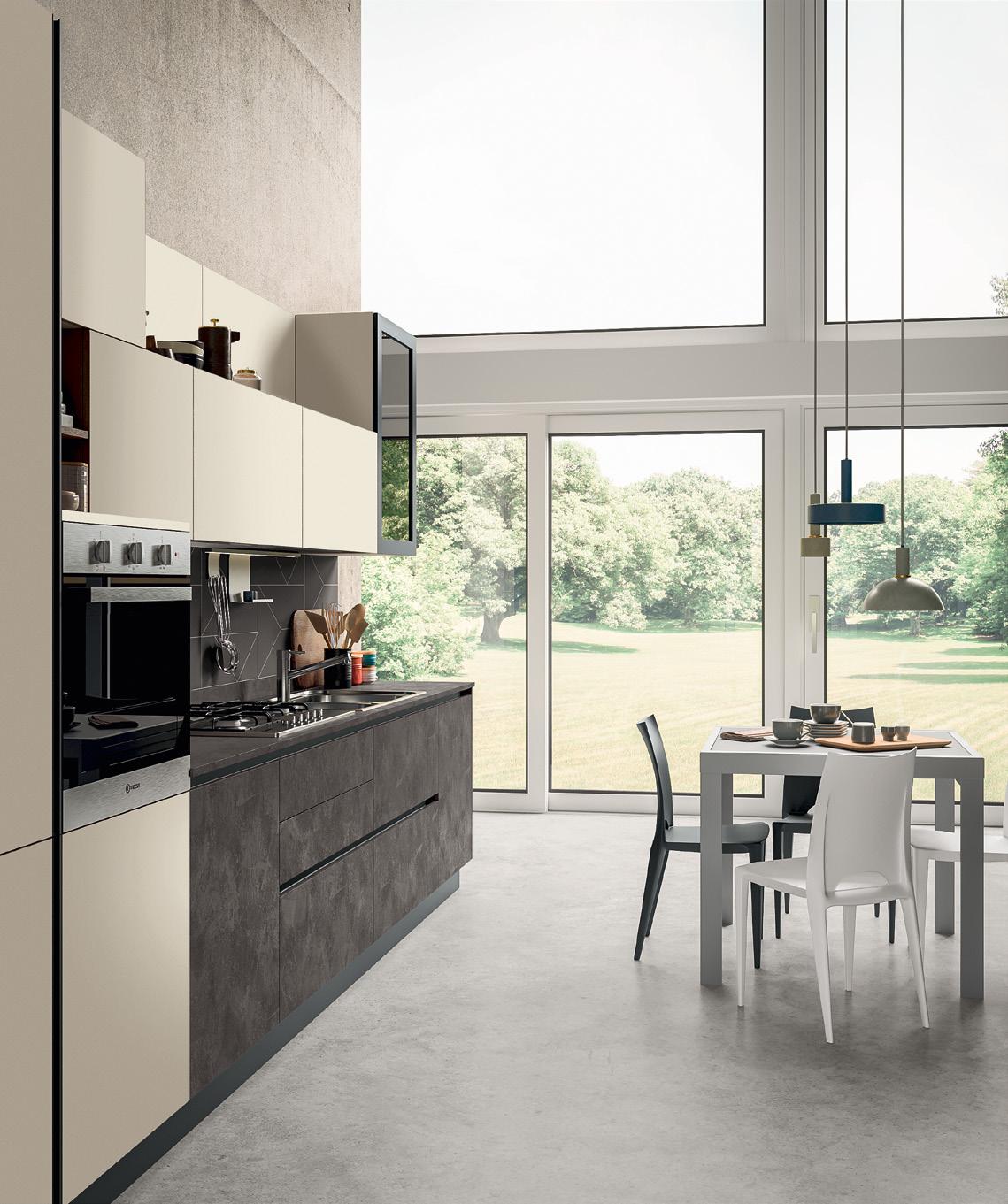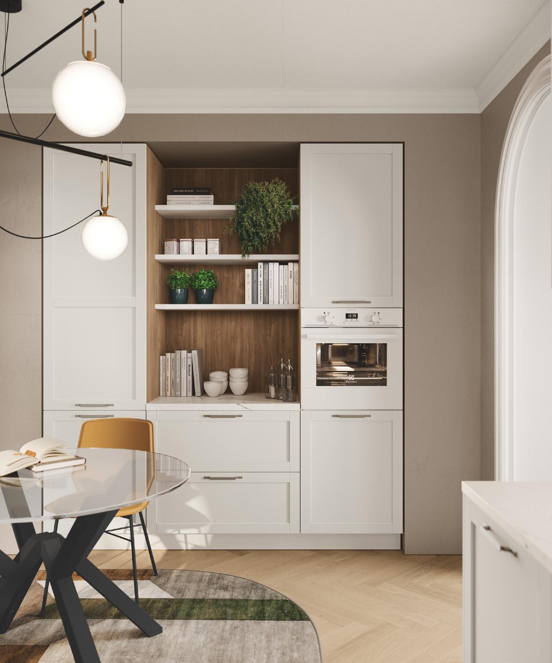 Ces lignes simples et claires inspirent un environnement domestique dans lequel tout se combine pour créer des moments inoubliables avec la famille et les amis. L’environnement est caractérisé par un mur central autour duquel se développent des armoires et des espaces de vie. Les éléments hauts sont façonnés pour permettre à la cuisine de se transformer d’un espace dédié à la préparation des aliments en un espace repas.