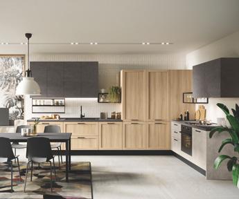 Forme semplici e chiare per ambienti domestici in cui tutto si fonde per far vivere momenti indimenticabili in famiglia e con gli amici. L’ambiente è connotato da una parete centrale attorno alla quale si sviluppano armadiature e zona giorno. pensili si plasmano per consentire alla cucina di trasformarsi da area deputata alla preparazione dei cibi ad area pranzo.