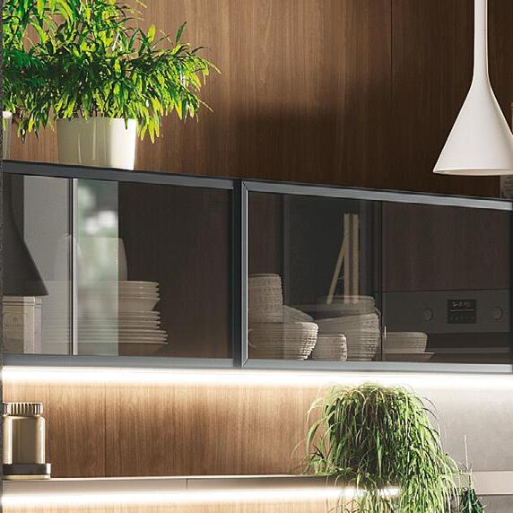 Mueble alto abierto con puertas correderas en cristal ahumado y estructura en aluminio negro mate, módulo abierto Unico en aluminio negro mate y baldas en Noce Svezia.