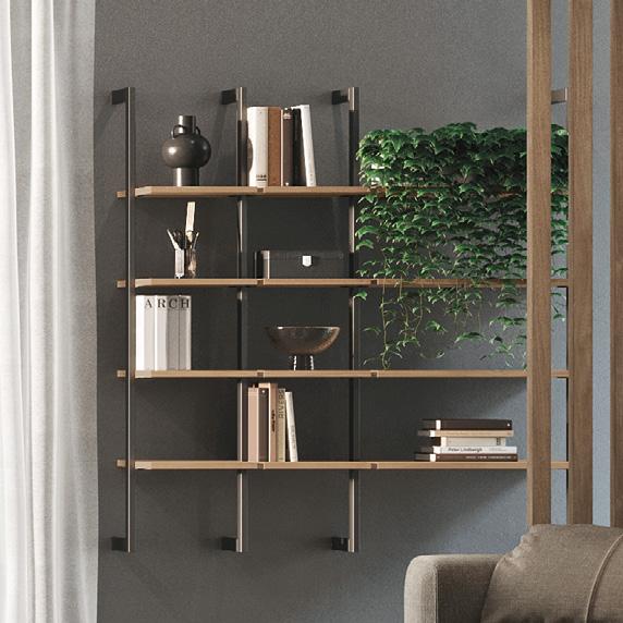 Unité murale ouverte avec portes coulissantes en verre fumé et cadre en aluminium noir mat, module ouvert Unico en aluminium noir mat et étagères en Noce Svezia.