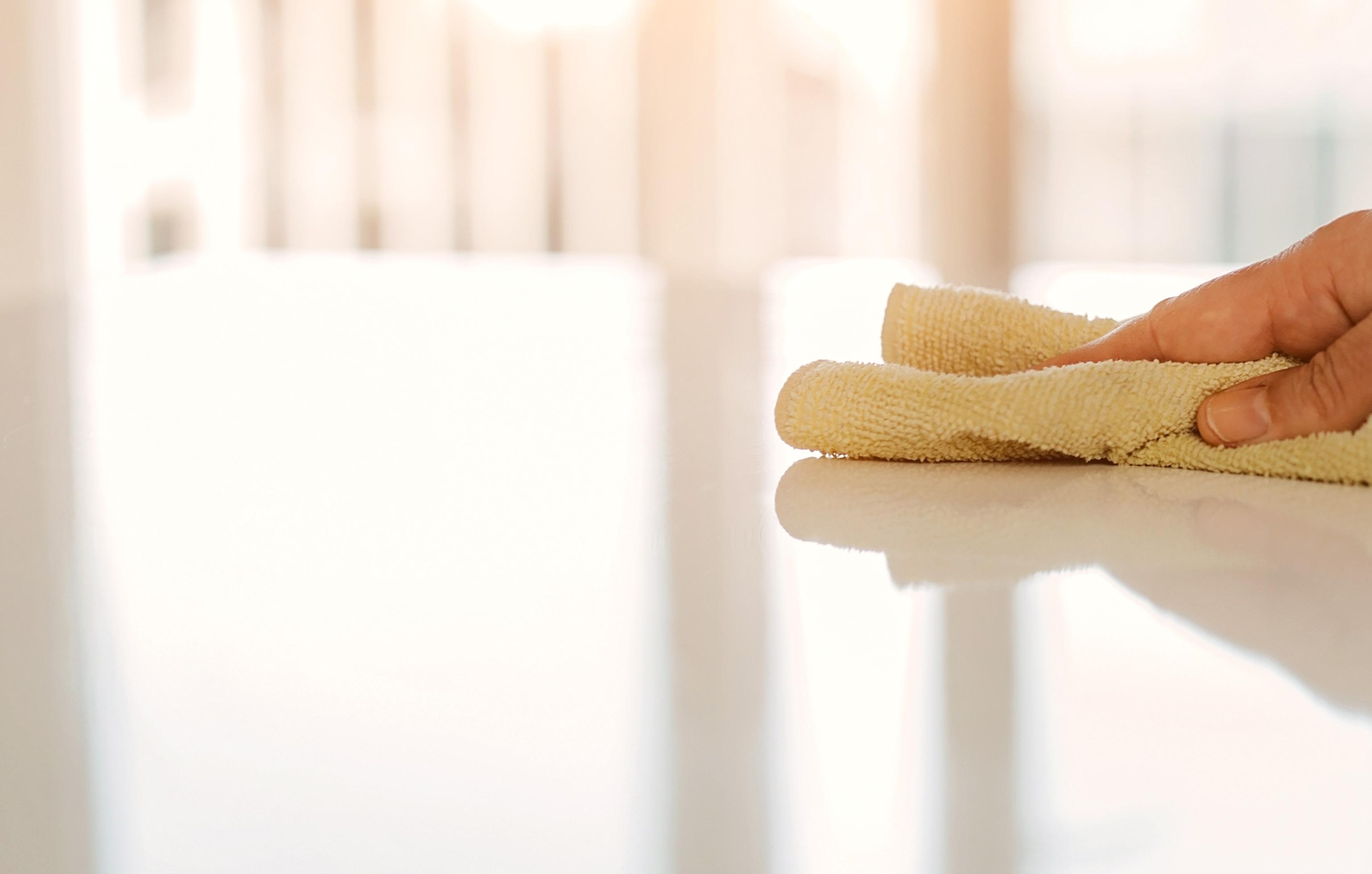 Tilfør en rikelig mengde desinfeksjon på overflaten. Bearbeid overflaten med en ren tørkeklut eller lofritt papir. Det er viktig at overflaten er fuktig under rengjøringen. Bruk hansker for å unngå uttørking av huden.