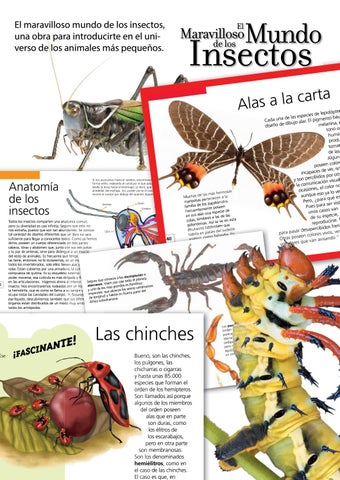Todos los insectos comparten una anatomía común, pero su diversidad es casi infinita. Seguro que esto no nos extraña, puesto que son tan abundantes. Se conoce Ojos tal variedad de diseños diferentes que un libro no será suficiente para llegar a conocerlos todos. Como ya hemos dicho, poseen un cuerpo diferenciado en tres partes: cabeza, tórax y abdomen que, junto con sus seis patas y su par de antenas, sirve para distinguir a un insecto del resto de animales. Es frecuente que tenga alas y si las tiene, entonces no lo dudaremos, es un insecto. De todos los invertebrados, solo ellos tienen alas y pueden volar. Están cubiertos por una armadura, la cutícula, compuesta de quitina. Es su esqueleto externo y, para rpiones o poder moverse, esa cutícula es más delgada y flexible a los esco planeta e conoces el qu do ro to gu si Se ca en las articulaciones. Viajemos ahora al interior de un Viven por Pandinus alacranes. insecto. Nos encontraremos rodeados por un líquido, grandes es te centímetros ás m s lo in de la hemolinfa, que es como se llama a su sangre y quey uno r, que alcanza los ve l a parte de rato ocupa todas las cavidades del cuerpo. Y, flotando enimpe itud y habita en buen ng lo de . na ese líquido, descubriremos también que sus diferentes ia ar rica subsah órganos están distribuidos de un modo muy similar alÁf de todos los artrópodos.