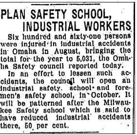 The Safety Council opened an Industrial Safety School motivated by learning that 661 individuals were injuried in industrial accidents in Omaha in the month of August alone.