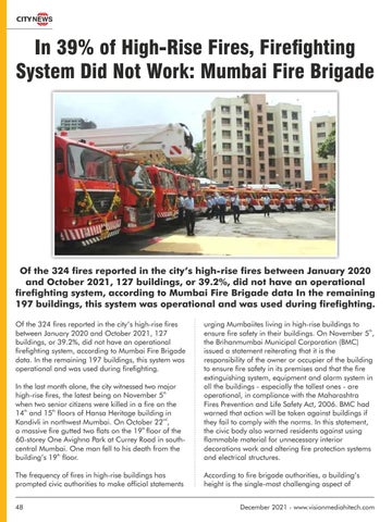 Of the 324 fires reported in the city’s high-rise fires between January 2020 and October 2021, 127 buildings, or 39.2%, did not have an operational firefighting system, according to Mumbai Fire Brigade data In the remaining 197 buildings, this system was operational and was used during firefighting. Of the 324 fires reported in the city’s high-rise fires between January 2020 and October 2021, 127 buildings, or 39.2%, did not have an operational firefighting system, according to Mumbai Fire Brigade data. In the remaining 197 buildings, this system was operational and was used during firefighting. In the last month alone, the city witnessed two major th high-rise fires, the latest being on November 5 when two senior citizens were killed in a fire on the 14th and 15th floors of Hansa Heritage building in nd Kandivli in northwest Mumbai. On October 22 , a massive fire gutted two flats on the 19th floor of the 60-storey One Avighna Park at Currey Road in southcentral Mumbai. One man fell to his death from the building’s 19th floor.
