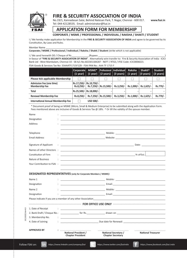 Fire & Security Association of India (FSAI) is a non profit organisation representing the fire protection, life safety, security, building automation, loss prevention & risk management domains and closely working with government & all other stakeholders to enable the Indian fire & security industry to reach global pre-eminence with better regulatory framework since 2002.