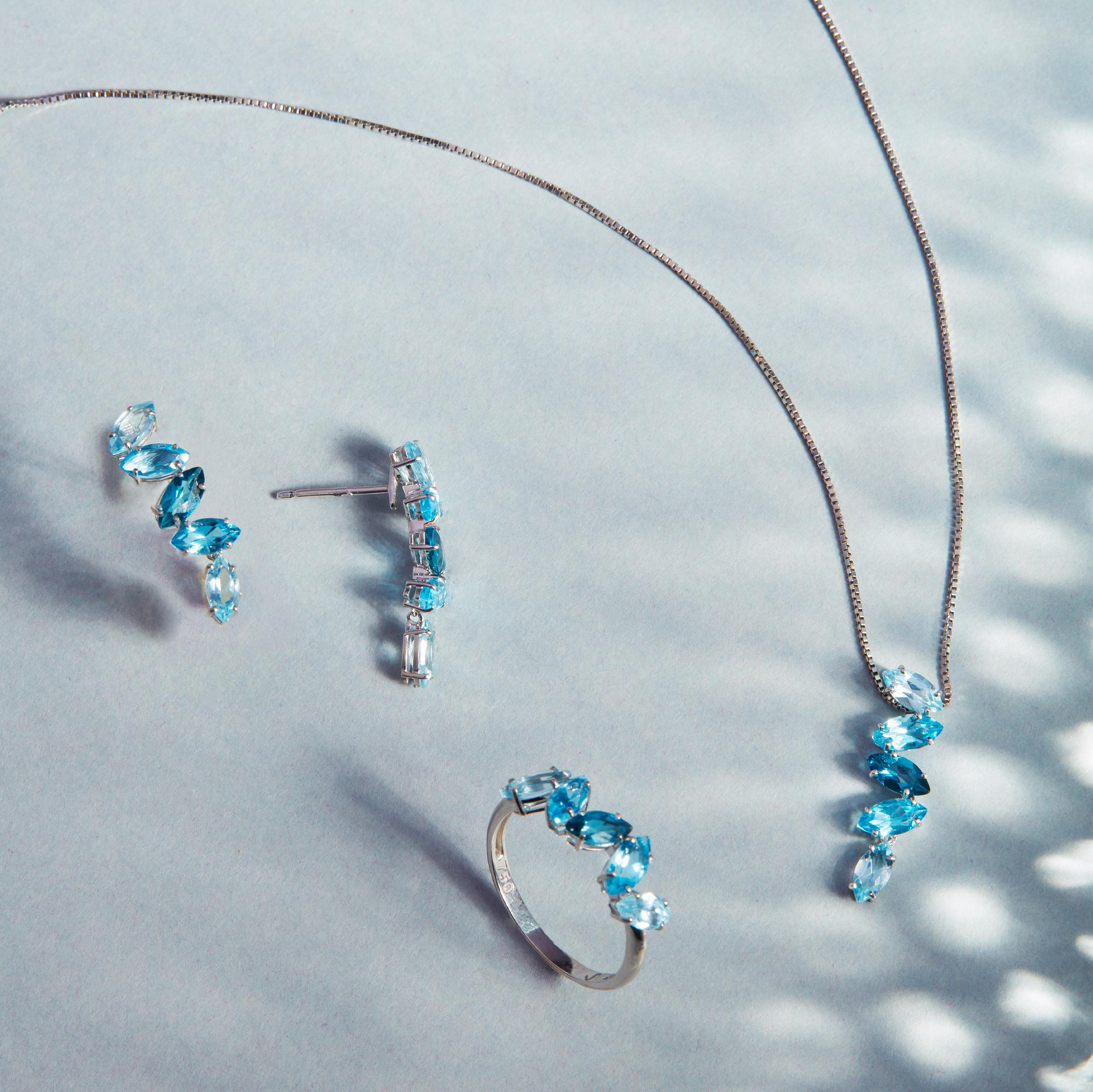 Do italiano, água, a Coleção Acqua homenageia o movimento e as nuances delicadas de azul das águas. Os topázios azuis, nessa cor que é tendência ganham ainda mais destaque ao lado do ouro branco 18k. Joias com a leveza das formas orgânicas e design exclusivo, perfeitas para compor qualquer look, seja com um jeans ou até um visual mais elegante.