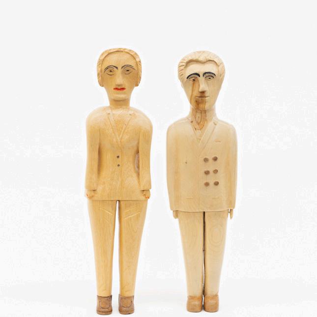 become sunken-cheeked and sad. As the carver gains more experience they see that this will not do, and take care to use a more massive piece of wood, so that they can achieve more natural facial features with projecting ears, lips and nose. In his earliest works Ragnar applied the former method: they are two-dimensional, with a flat back –which does not matter, as they stand against a wall – though the footwear is carved threedimensionally, including the back. Only three colours are seen, in addition to the natural wood tones: shoes and hair in black and brown, and red nails and lips. These are, nonetheless, fully authentic works – his clear-varnished pioneers, bashful couples with neatly-combed hair and delicate facial features. Essentially these works reflect aspects of woodcarving courses attended by the artist; they generally begin with flat carving, cutting into a surface to achieve some depth, but not delving deeper into the wood, except in other woodcarving projects such as chains made up of interlocking links