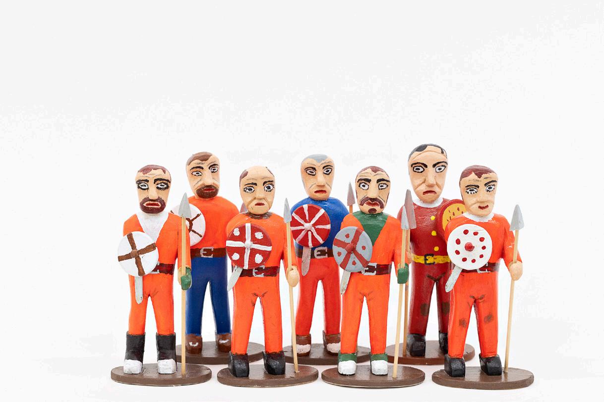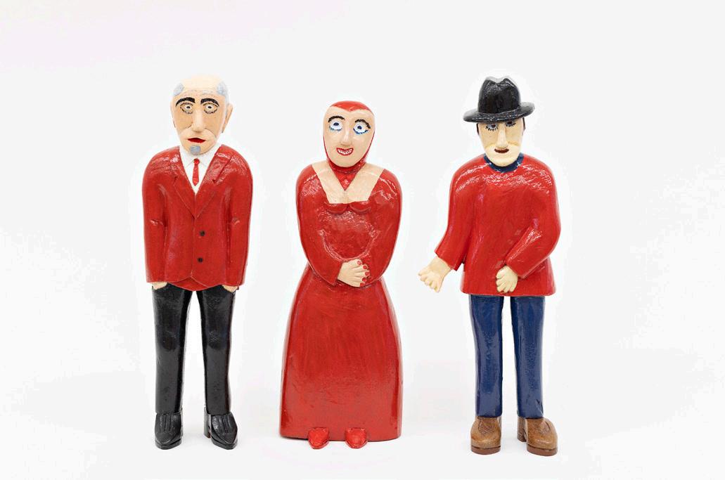 standa hlið við hlið, rjúpnaskyttur eru í felubúningum með langskeftar byssur, smiður og garðyrkjumaður stíga fram með tól sín, þá virðulegar húsfrúr, upphafnir embættismenn og óljósar persónur úr smiðju höfundur. Þetta fólk er með stór kringlótt augu í djúpum tóttum og áberandi bráhár, sumt með óræðan svip líkt og það viti ekki hvernig það eigi að taka athyglinni sem það fær. Á síðara vinnslustigi eru vígalegir veiðimenn með riffla og nýskotna seli við fót, sveigðir í mjöðmum og hnjám, og einn uppábúinn karl tekur dansspor upp tröppur, kannski sjálfsmynd? Skórnir vekja þó mesta athygli enda er leitun á slíkri natni í íslenskri alþýðulist. Þessi flokkur karla og kvenna er eins og hjörð af lífsþyrstum einstaklingum sem treysta á samheldni til að lifa af. Litadýrðin er áþreifanleg vegna lakksins í stærri verkunum, sem glampar af eins og gleri sé brugðið upp til að slá þann út af laginu sem nálgast persónulegt rými meira en góðu hófi gegnir, en minni verk eru mattari og þægilegri á að líta