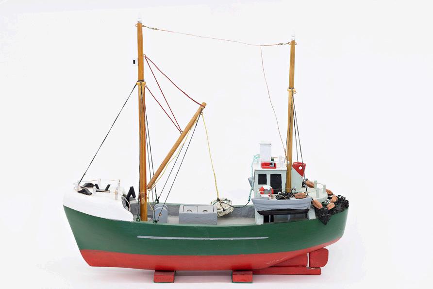 wood. He has a plan – urged on by his wife – to escape his daily toil by making a contribution to creation, other than children – their children. Something that is outside the everyday, elevates the spirit and resounds in human hearts. Long rows of carved people – initially on a window-sill at home, to see whether he could do better, to finish, rub down and paint, and then to exhibit if anyone is interested – even at a gallery, and maybe sell a few. A model of his boat Bjarmi must also be displayed on a pedestal, as well as other boats with which he is familiar – at a distance out at sea, or moored at the boatyard – and he sees them clearly in his mind’s eye as he falls asleep. He is jerked from his reverie as a slight current along the coast pushes the boat into motion. And shortly afterwards he sees the tackle tautening on the port side where an arctic char has bitten on the bait on its way into Eyjafjörður. He lands the fish and lays it under an old sheet of sailcloth to keep it fresh, then heads north of the island to see whether he can find something to lay in salt