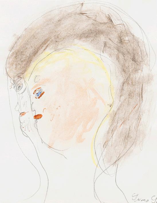 here are big flowers, mostly in motion; faces are seen in profile, sometimes one inside another, up to as many as five, as if the artist is anatomising what lies hidden within the soul, to bring out what is worthy to be seen by others than herself