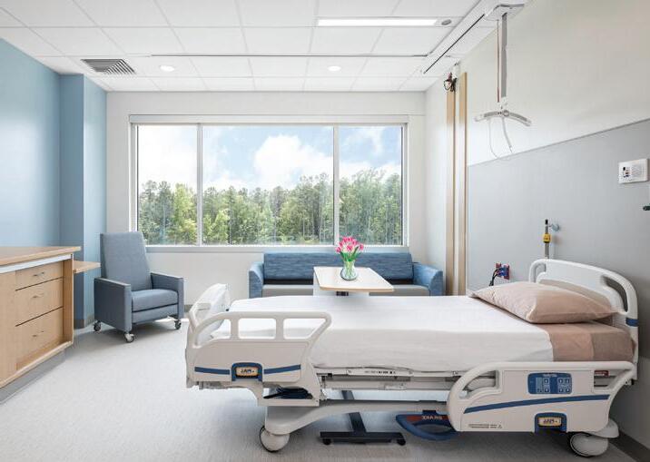 Spacious, private patient rooms are equipped with en-suite bathrooms, large picture windows with nature views, patient lifts, flat-screen TVs, and lay-flat furniture for visitors.
